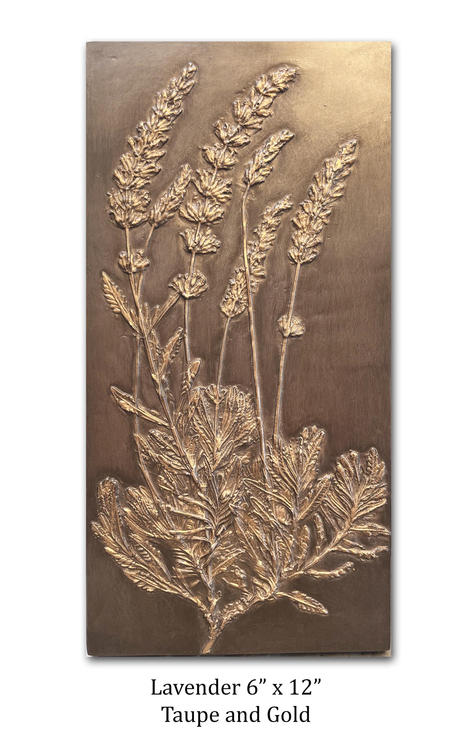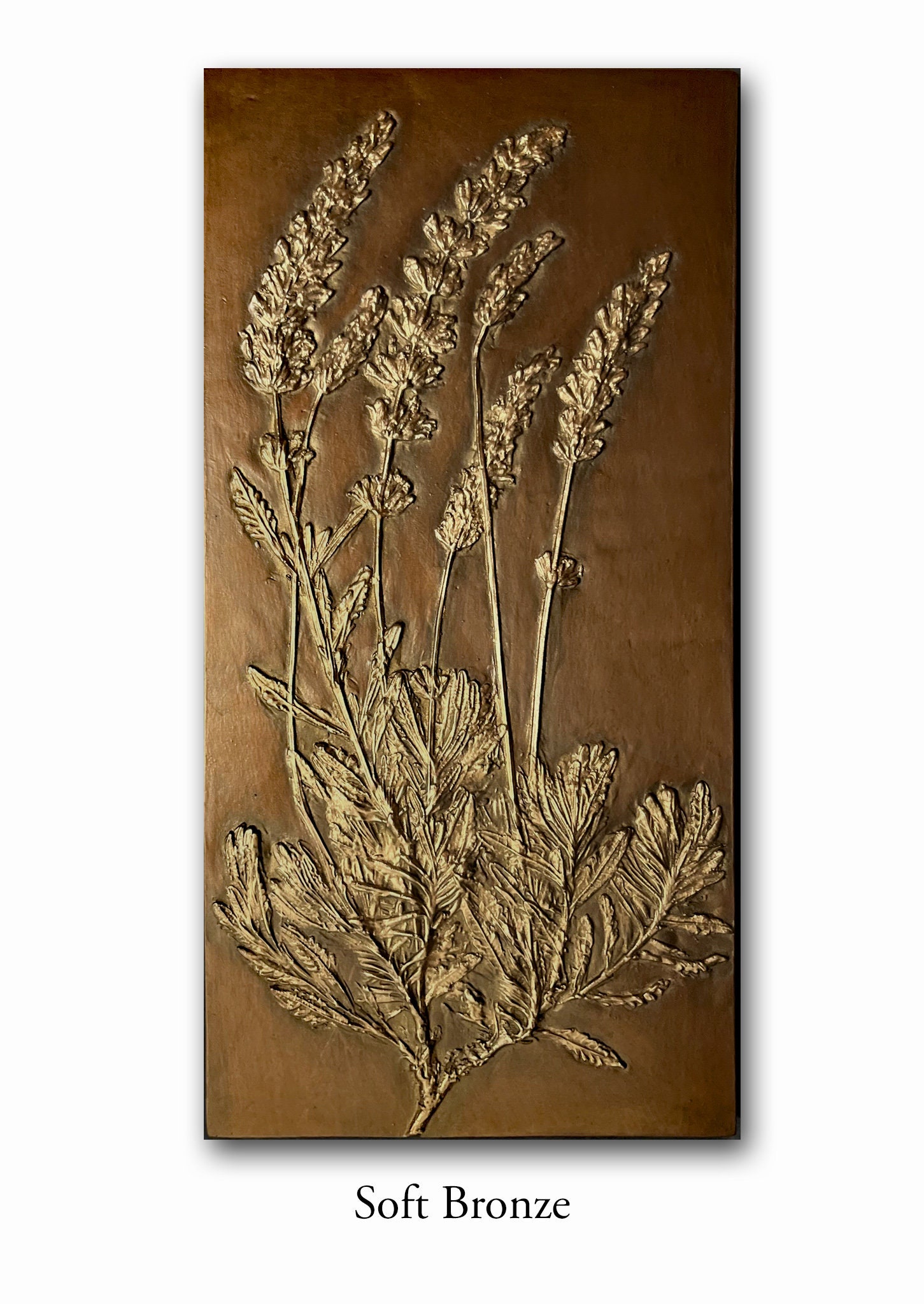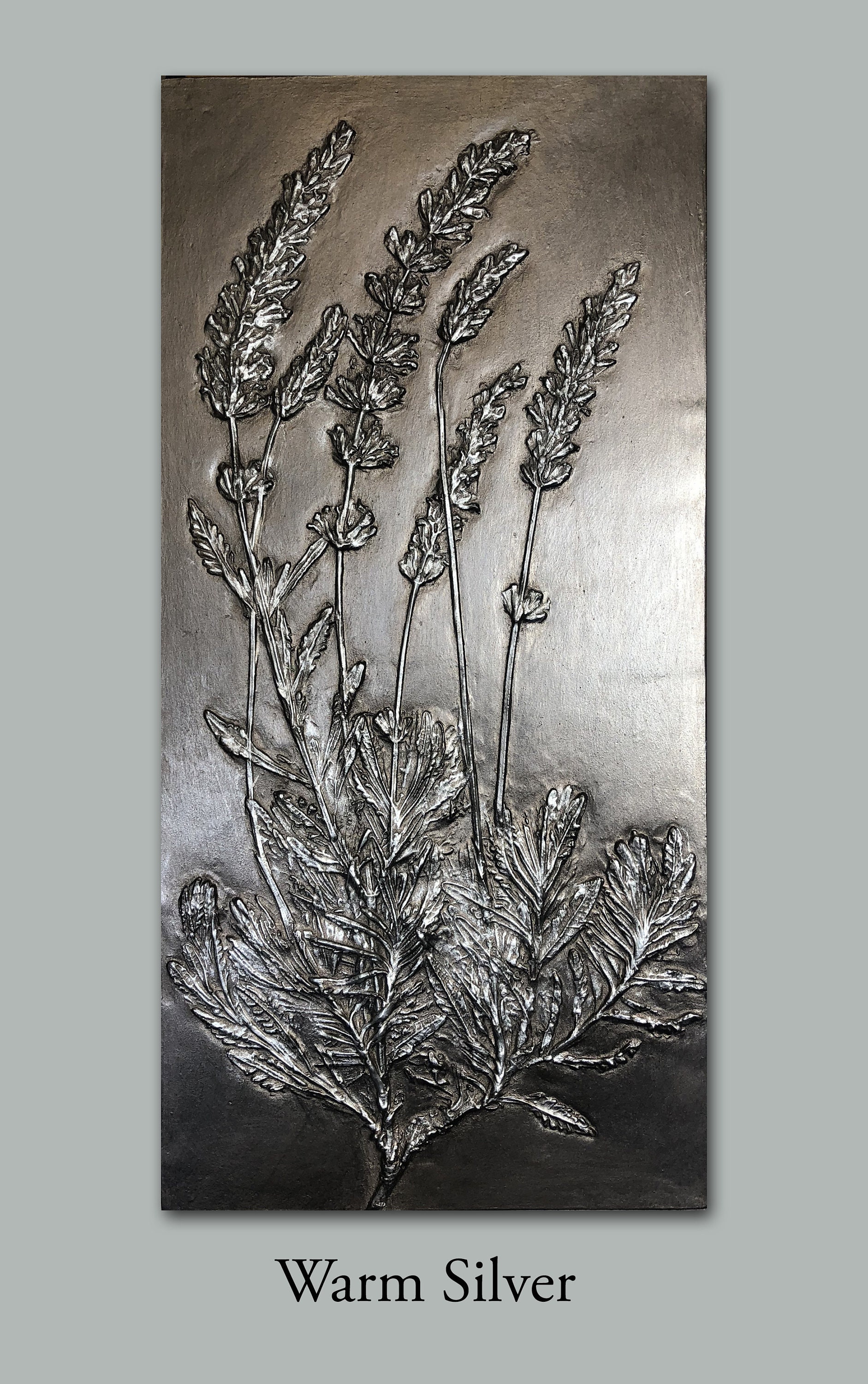 To create our panels, boxes and mirrors I use real leaves, shells, rocks, seaweed, flowers and seed pods to make molds from urethane and silicone rubbers. In some cases, a more elaborate process is used, for instance creating rubber seaweed from real wet, slippery seaweed. Each new design may take anywhere from 50 to 200 hours work before we can start production. Once the mold has been made the object is cast in one of 2 kinds of architectural gypsum cement. The piece is then finished with three to five coats of natural shellac and metallic powders. A patina is applied, dried, rubbed with steel wool, hand polished and highlighted. We have designed and produced mirrors as large as 11’ long as well as fireplace surrounds and sculpture.
