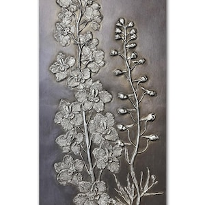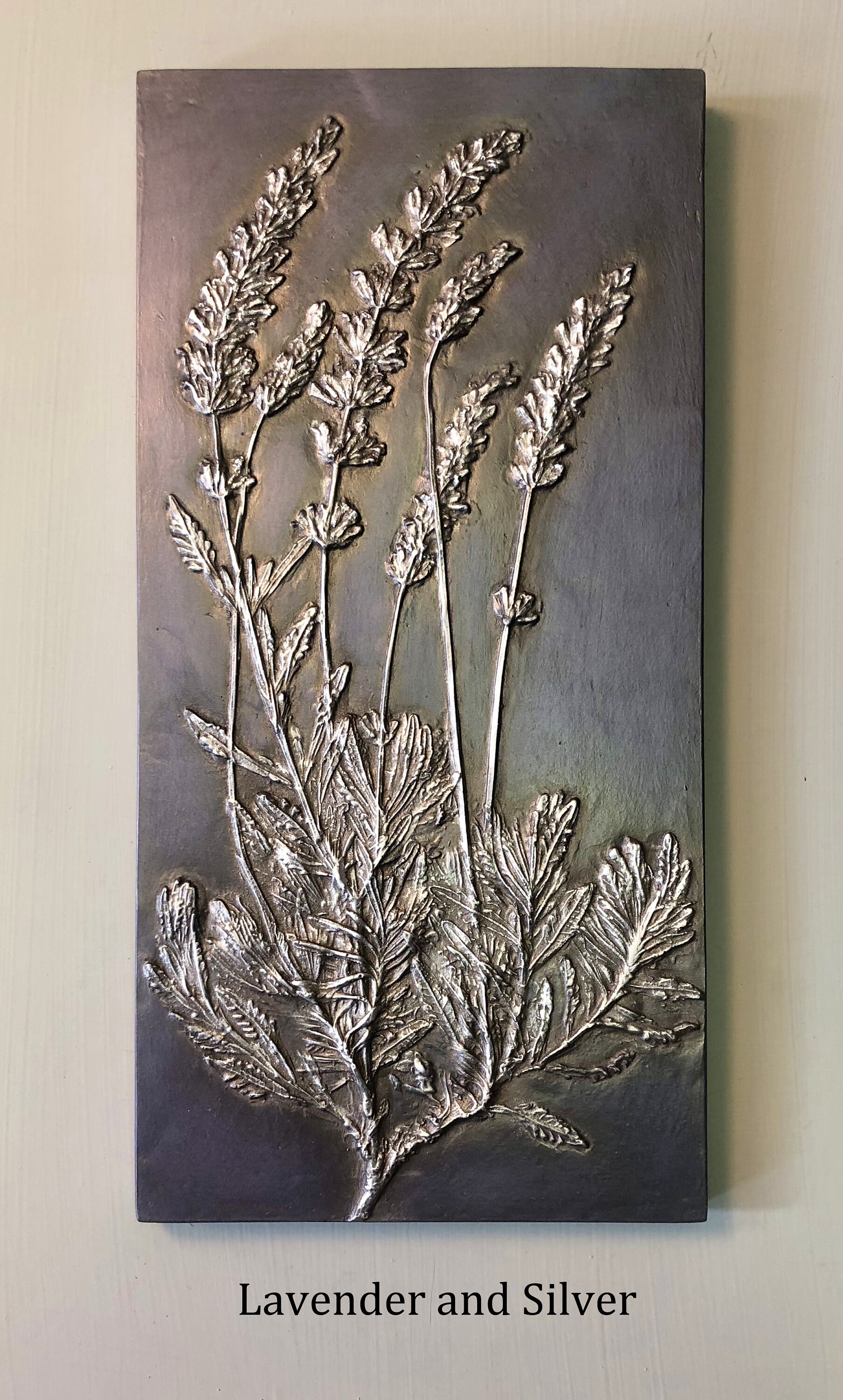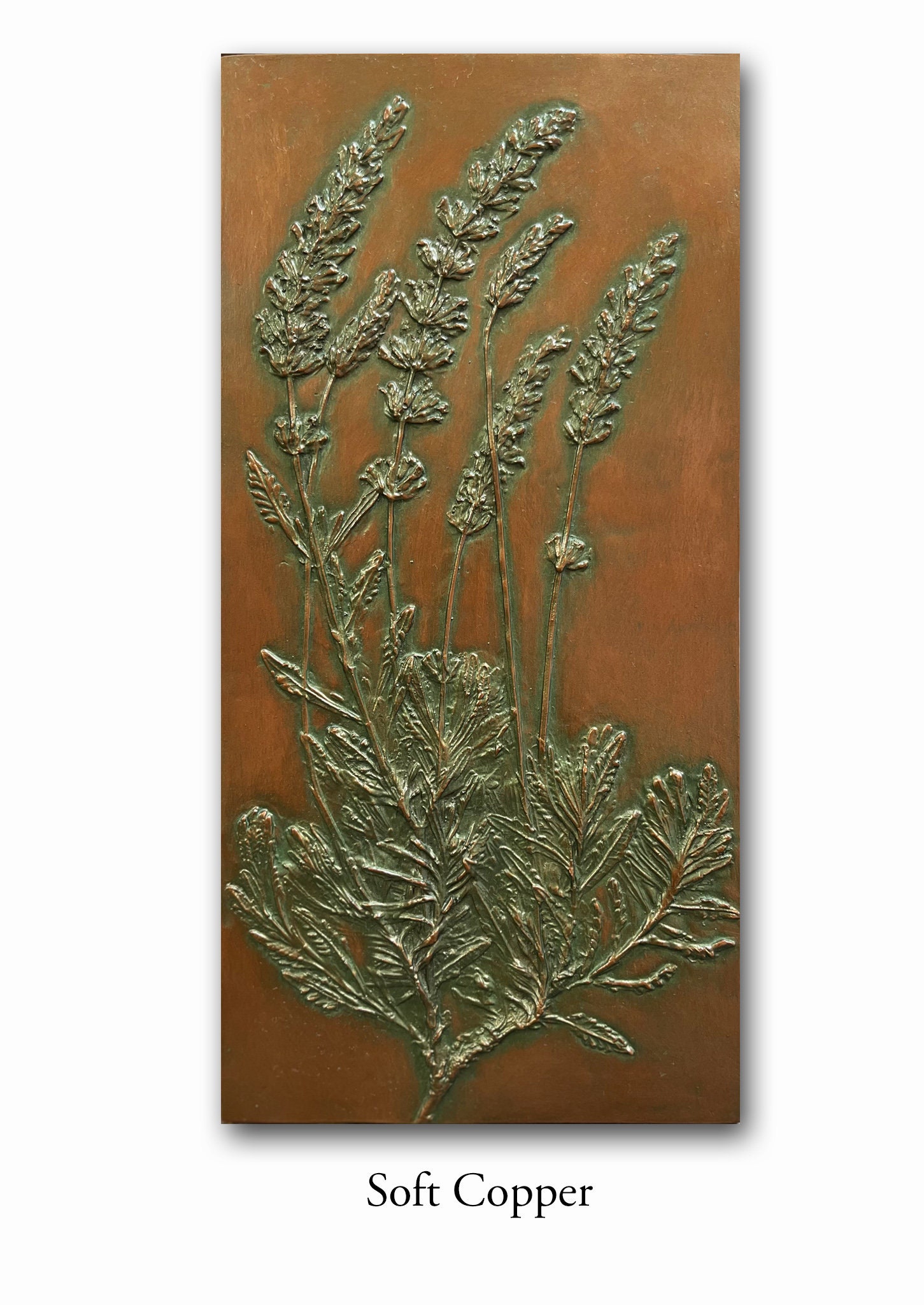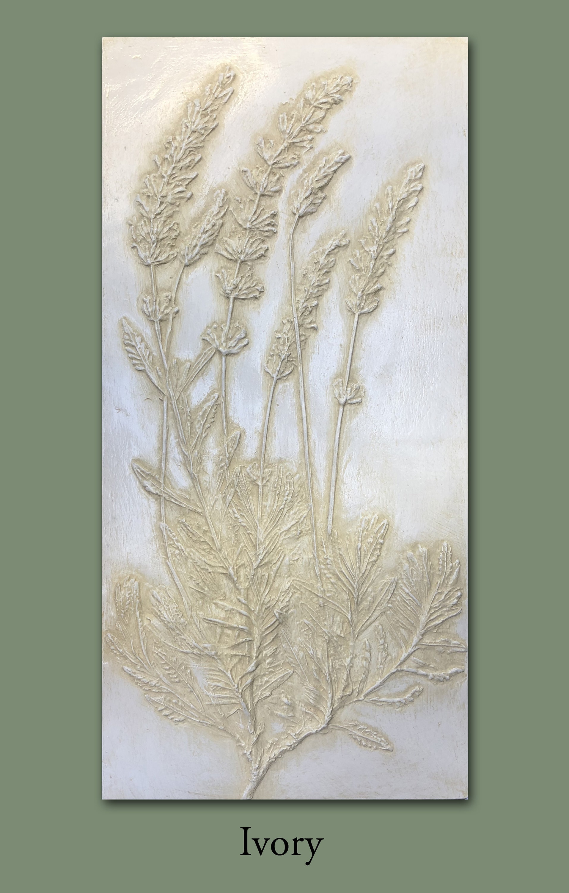 To create our panels, boxes and mirrors I use real leaves, shells, rocks, seaweed, flowers and seed pods to make molds from urethane and silicone rubbers. In some cases, a more elaborate process is used, for instance creating rubber seaweed from real wet, slippery seaweed. Each new design may take anywhere from 50 to 200 hours work before we can start production. Once the mold has been made the object is cast in one of 2 kinds of architectural gypsum cement. The piece is then finished with three to five coats of natural shellac and metallic powders. A patina is applied, dried, rubbed with steel wool, hand polished and highlighted. We have designed and produced mirrors as large as 11’ long as well as fireplace surrounds and sculpture.