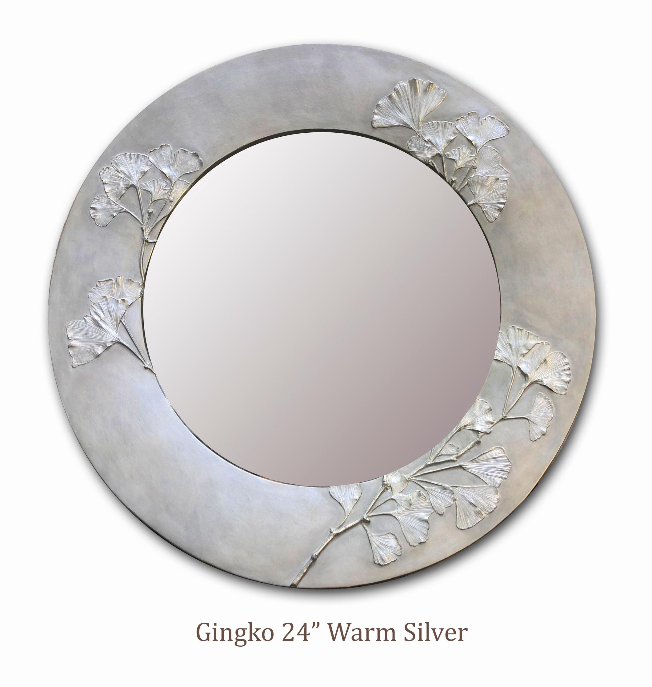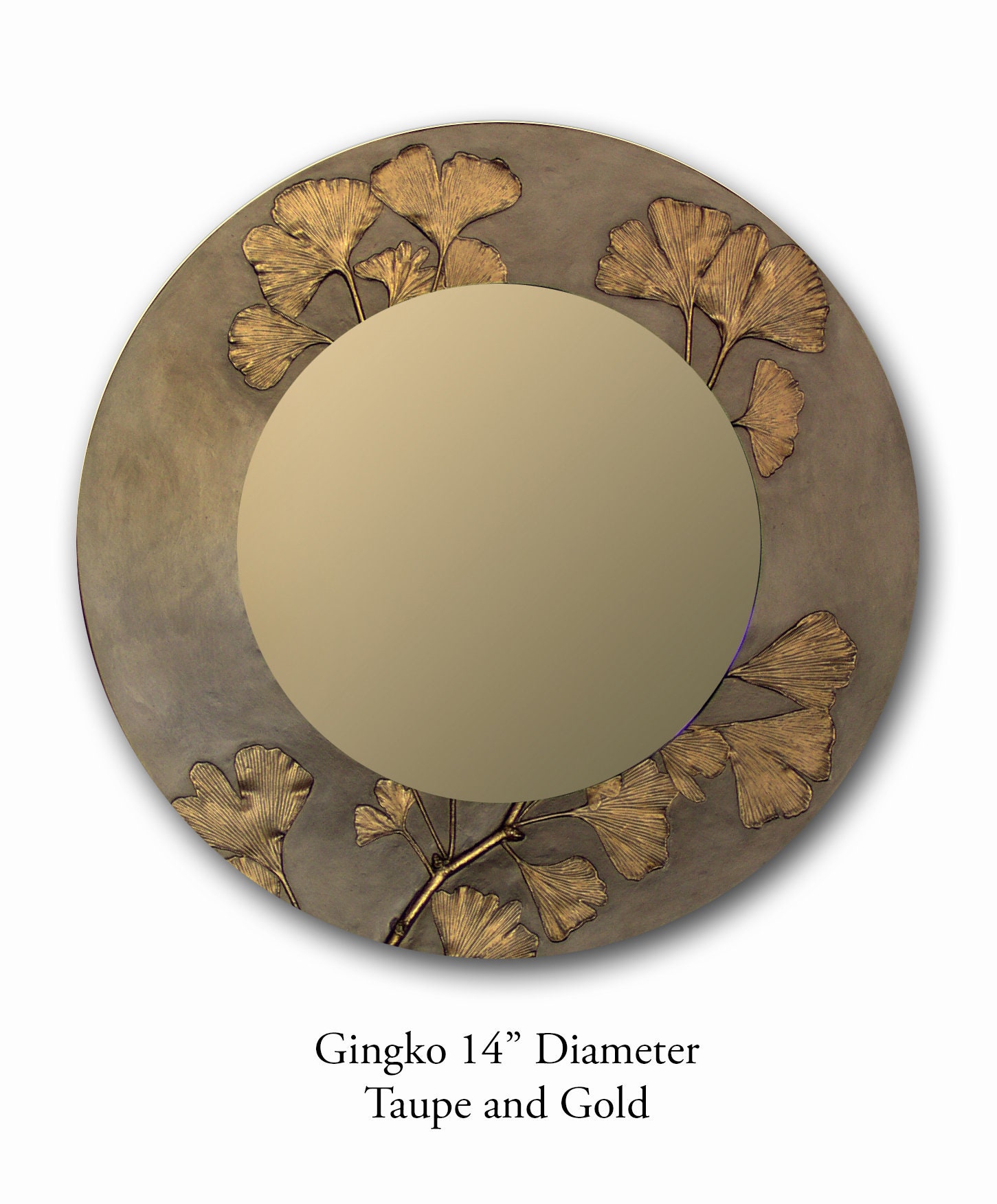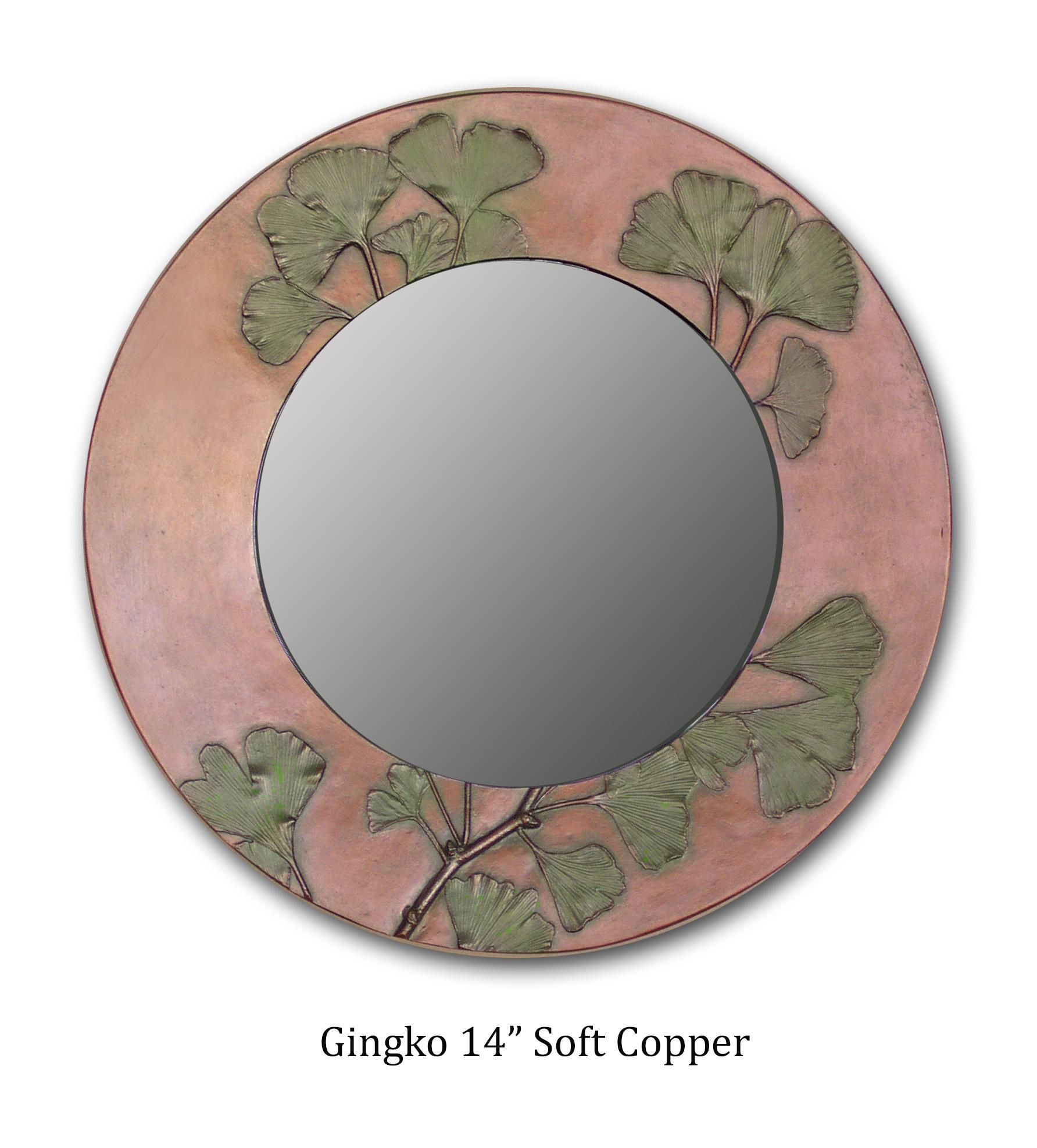 BlindSpot uses real leaves and branches to create the molds for these small mirrors. The fan like leaves of the ancient tree are well known as a design element. We use our unique metallic patinas to bring out the definition of the texture of the leaves. All the items using the Gingko leaf were made from an original 11" x 20" panel that I made for my mother about 25 years ago. I just used the branches from the tree to make impressions, then I cast a panel that had only branches. On this positive I used the actual leaves glued on with some additional trickery and made a mold directly over the leaves. Using this method I was able to get better dimension on the leaves and really show the beautiful veins. In addition to the sizes shown here, there are many larger rounds, rectangles and an oval. Please contact me if interested in larger sizes.