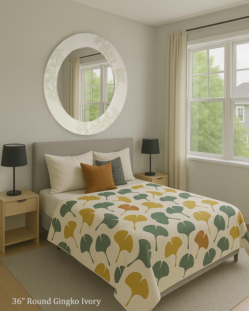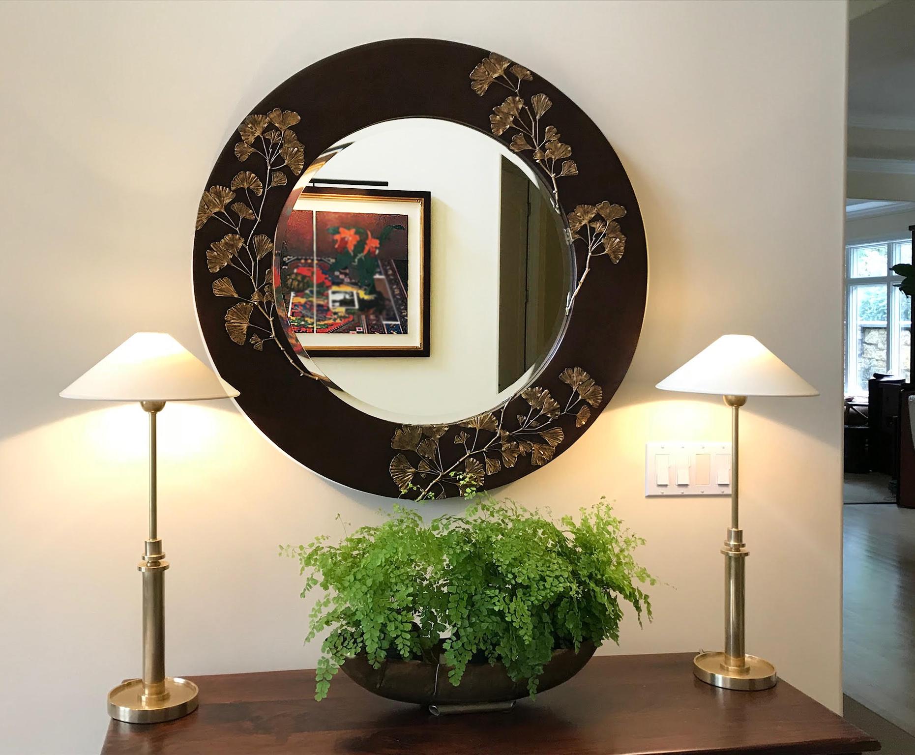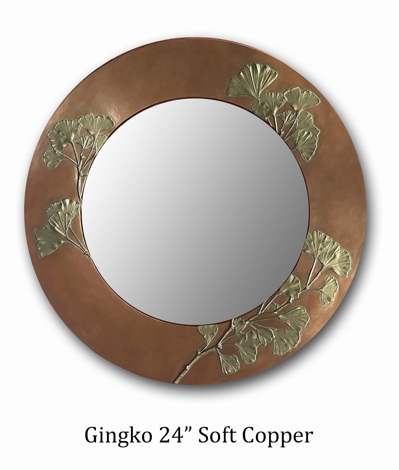 BlindSpot uses real leaves and branches to create the molds for these small mirrors. The fan like leaves of the ancient tree are well known as a design element. We use our unique metallic patinas to bring out the definition of the texture of the leaves. All the items using the Gingko leaf were made from an original 11" x 20" panel that I made for my mother about 25 years ago. I just used the branches from the tree to make impressions, then I cast a panel that had only branches. On this positive I used the actual leaves glued on with some additional trickery and made a mold directly over the leaves. Using this method I was able to get better dimension on the leaves and really show the beautiful veins. In addition to the sizes shown here, there are many larger rounds, rectangles and an oval. Please contact me if interested in larger sizes.