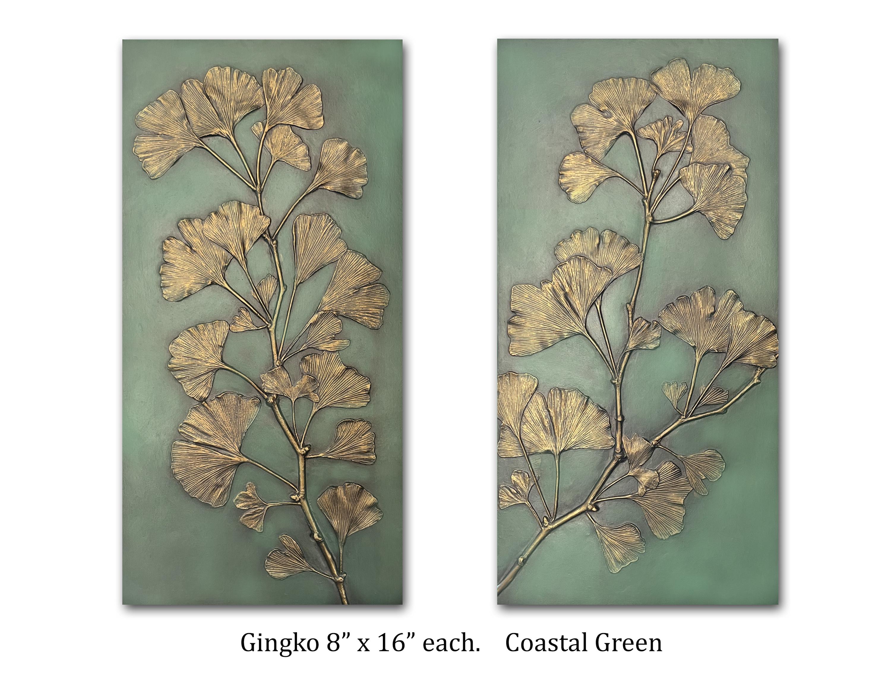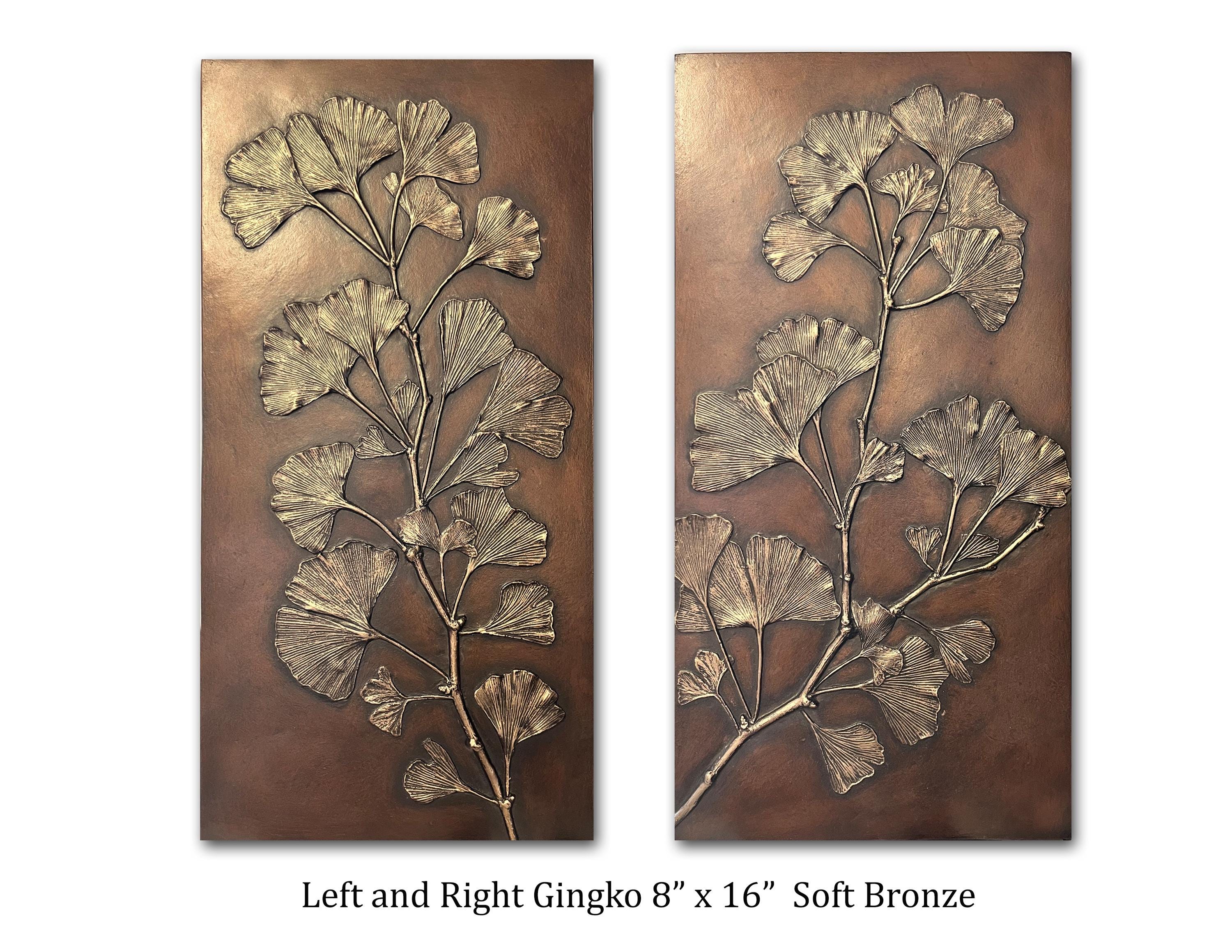 BlindSpot uses real leaves and branches to create the molds for these decorative wall panels. The fan like leaves of the ancient tree are well known as a design element. We use our unique metallic patinas to bring out the definition of the texture of the leaves. All the items using the Gingko leaf were made from an original 11" x 20" panel that I made for my mother about 25 years ago. I used the branches from the tree to make impressions, then I cast a panel that had only branches. On this positive I used the actual leaves glued on with some additional trickery and made a mold directly over the leaves. Using this method I was able to get better dimension on the leaves and really show the beautiful veins.