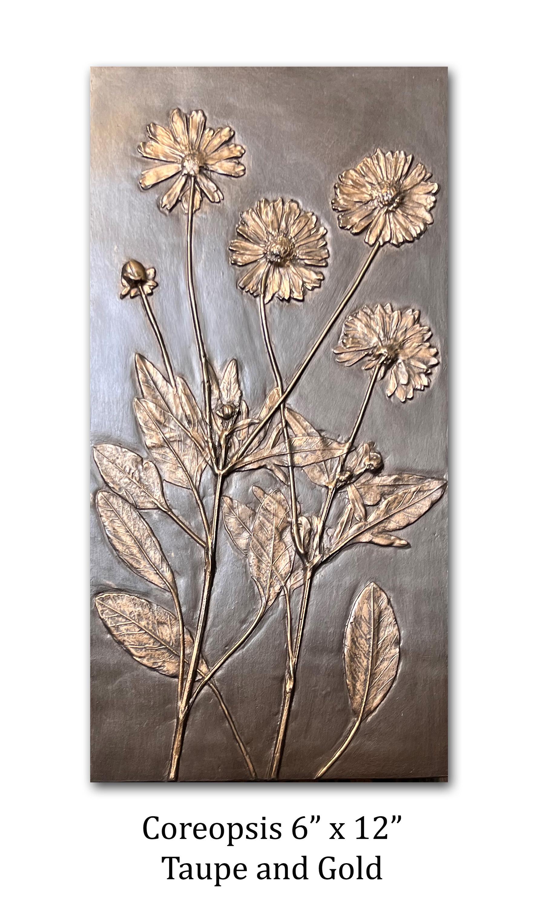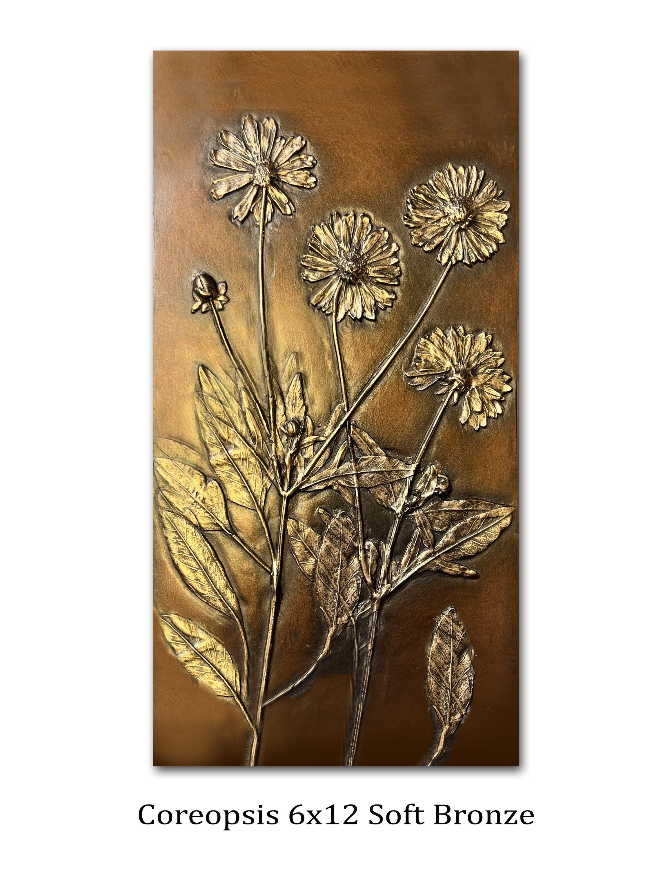 Coreopsis flower 6" x 12" wall panel with blossoms, buds and leaves.