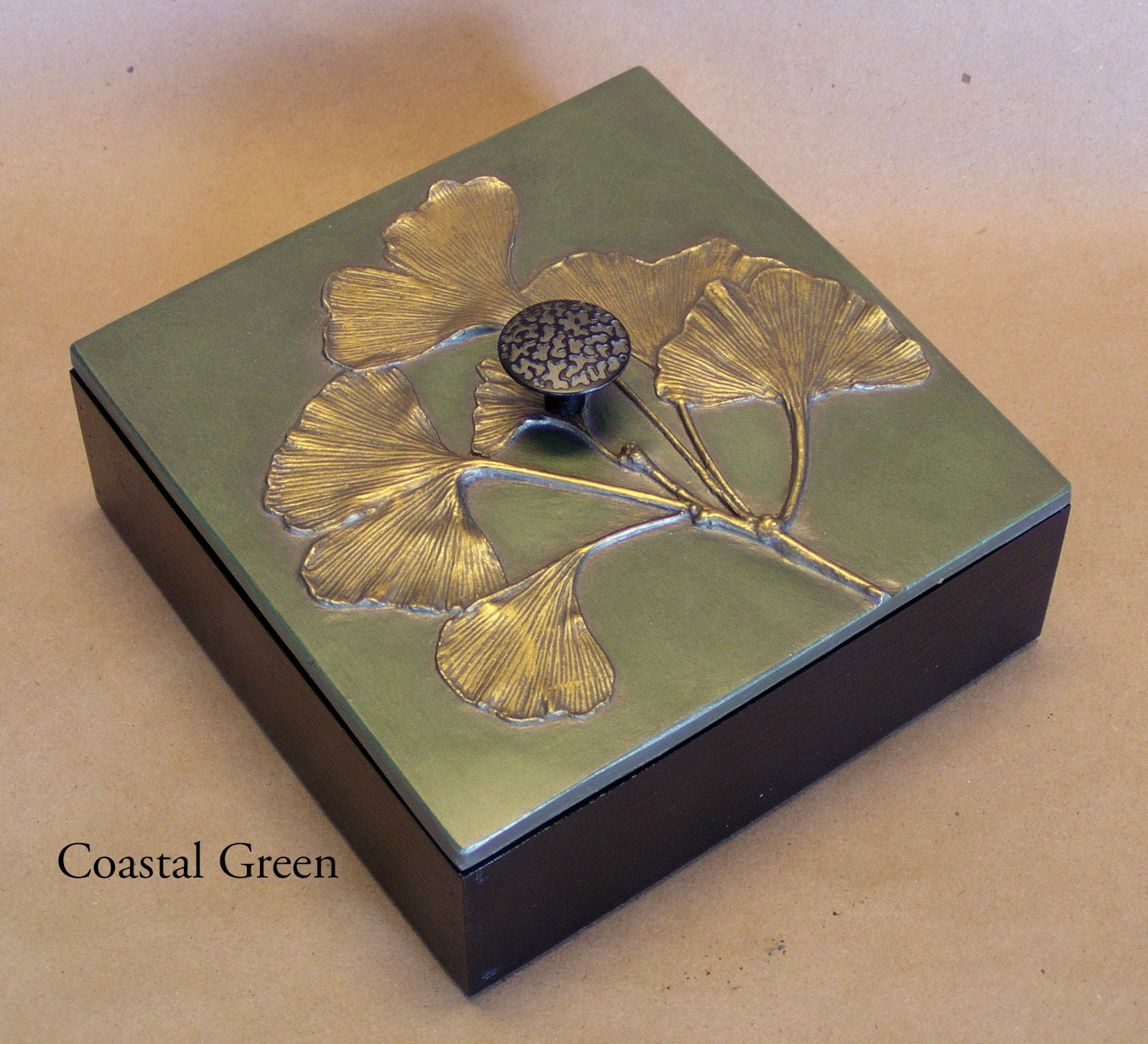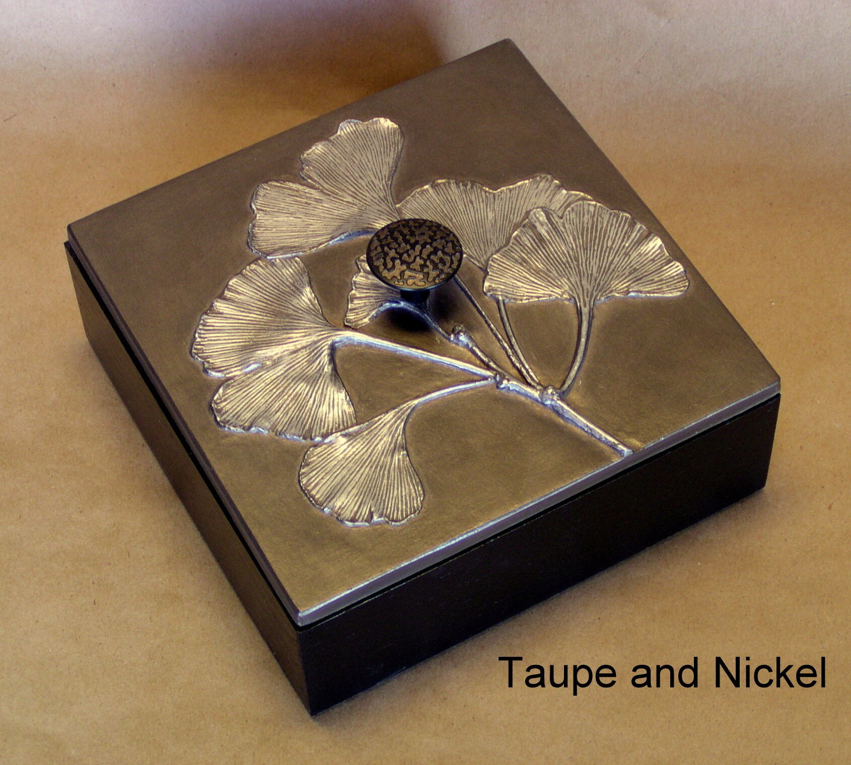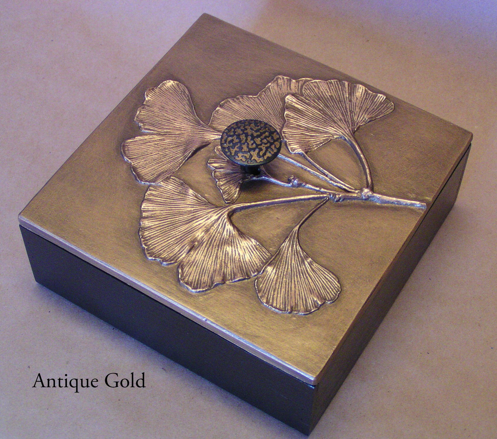 Directly from nature, Blindspot uses real leaves to create the molds for these decorative boxes. The small size is 6" x 6" and about 3" tall including knob. We use them to store cocktail napkins, jewelry. odds and ends. The box is made from bamboo and we make the lids in the studio using fiber reinforced gypsum cement. They are finished with natural shellac and metallic pigments. Available in sixteen special patinas.All the items using the Gingko leaf were made from an original 11" x 20" panel that I made for my mother about 20 years ago. I just used the branches from the tree to make impressions, then I cast a panel that had only branches. On this positive I used the actual leaves glued on with some additional trickery and made a mold directly over the leaves. Using this method I was able to get better dimension on the leaves an really show the beautiful veins.