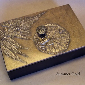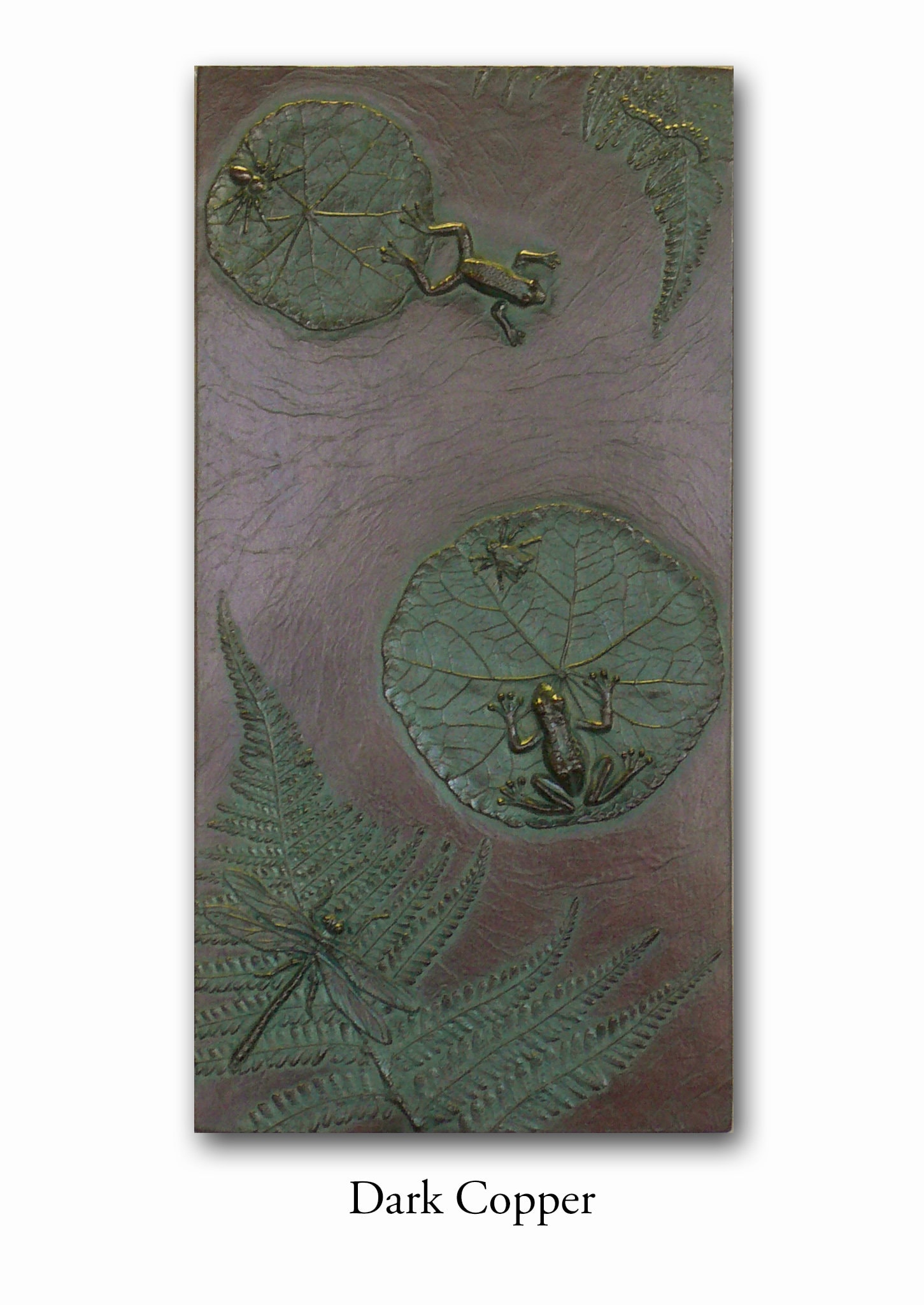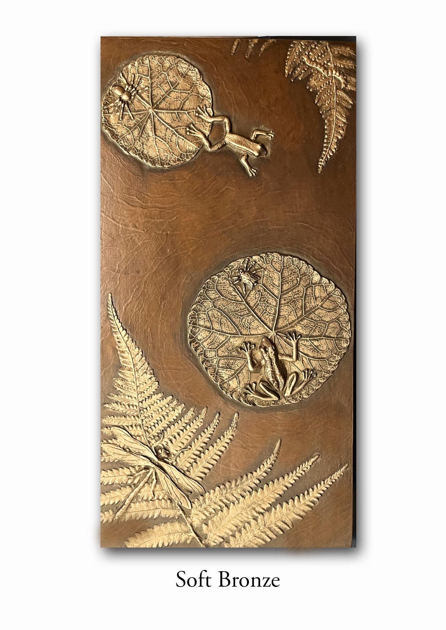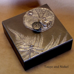 When I first began making mirror frames using found objects, my son was very young. He had a collection of plastic animals and monsters. He and his friends (with my encouragement) made a series of "monster medallions". The tiny monster mirror I made became one of the first items I sold. Stealing his plastic animals was addictive and eventually led to the Frog Pond box and panels. He is now in his 30's but still brings me beautiful things like the kelp from the ocean to use. We use real leaves but not real frogs or dragonflies to create molds for our unique botanical box lids and panels. These small whimsical 6" x 12" wall panels are perfect for the nursery or bathroom and are available in 16 unique patinas. They are wired on the back to hang on the wall or will fit nicely on a shelf by using a tripod plate stand,