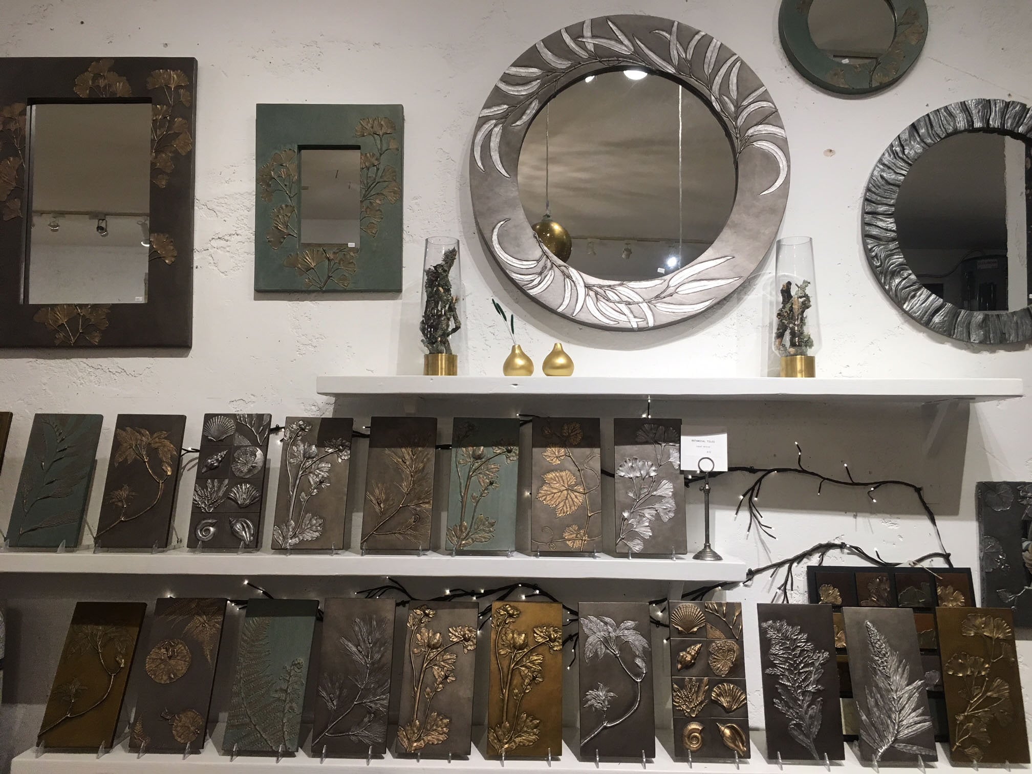 To create our panels, boxes and mirrors I use real leaves, shells, rocks, seaweed, flowers and seed pods to make molds from urethane and silicone rubbers. In some cases, a more elaborate process is used, for instance creating rubber seaweed from real wet, slippery seaweed. Each new design may take anywhere from 50 to 200 hours work before we can start production. Once the mold has been made the object is cast in one of 2 kinds of architectural gypsum cement. The piece is then finished with three to five coats of natural shellac and metallic powders. A patina is applied, dried, rubbed with steel wool, hand polished and highlighted. We have designed and produced mirrors as large as 11’ long as well as fireplace surrounds and sculpture.