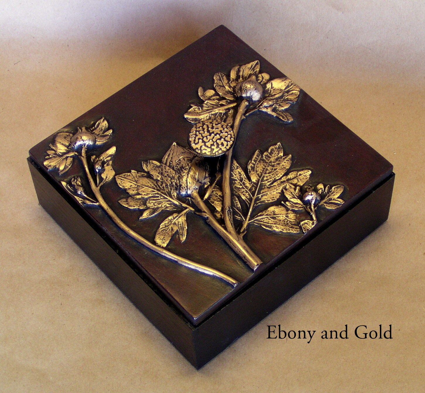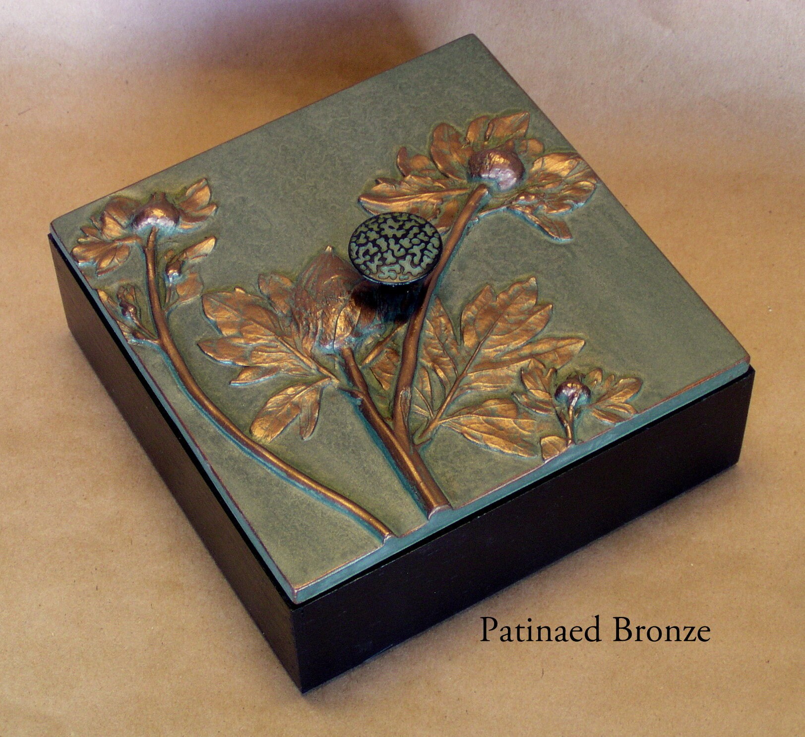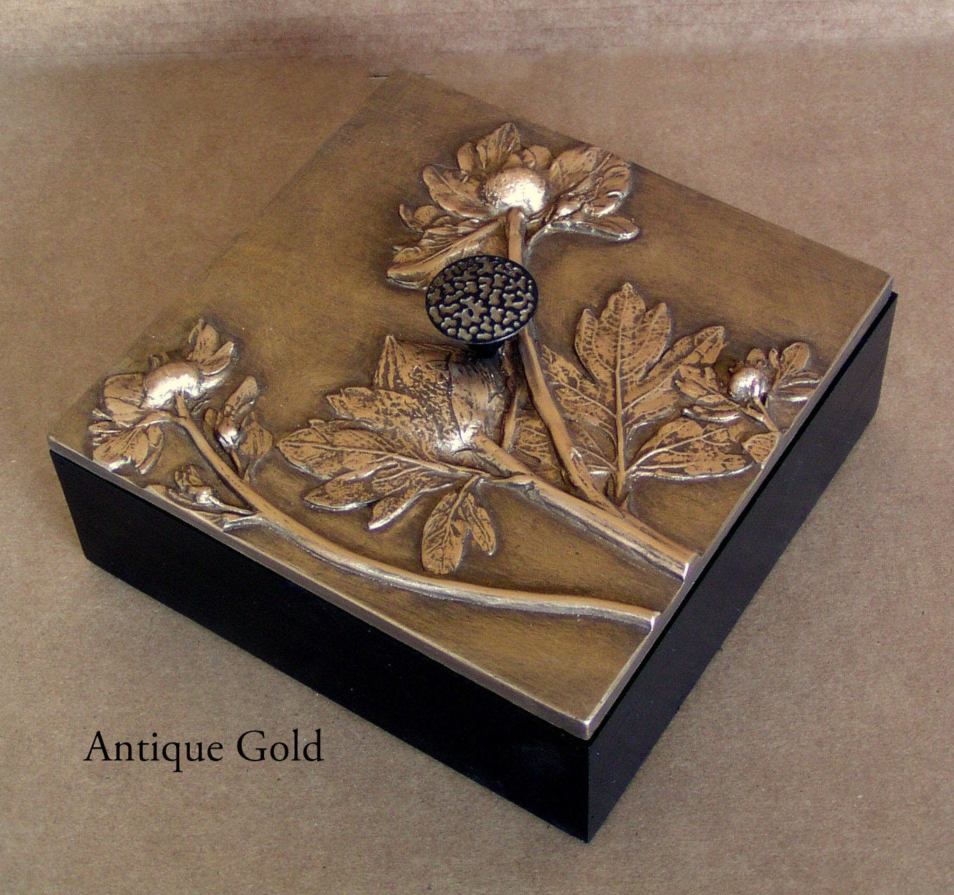 At BlindSpot we enjoy finding unusual things to use for our small decorative storage boxes. The buds of the California native Matilija Poppy are complex and a bit hairy. Being a California native myself, I admire the tall plant with the huge white flowers. Some call it a Fried Egg, but Matilija has 3 dotted letters and I love that. The size is 6" x 6" and about 3" tall including the knob and has interior dimensions of 5 3/8"x 5 3/8" x 2". It is available in sixteen unique metallic patinas.