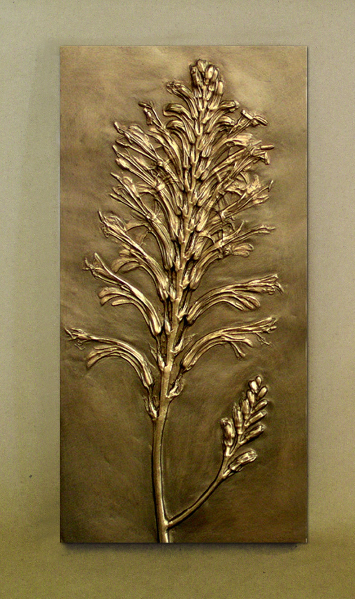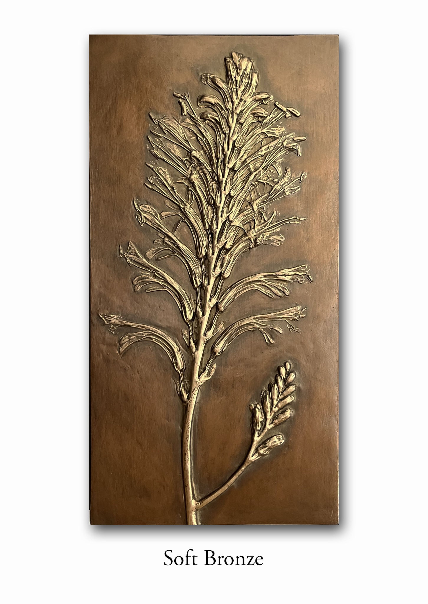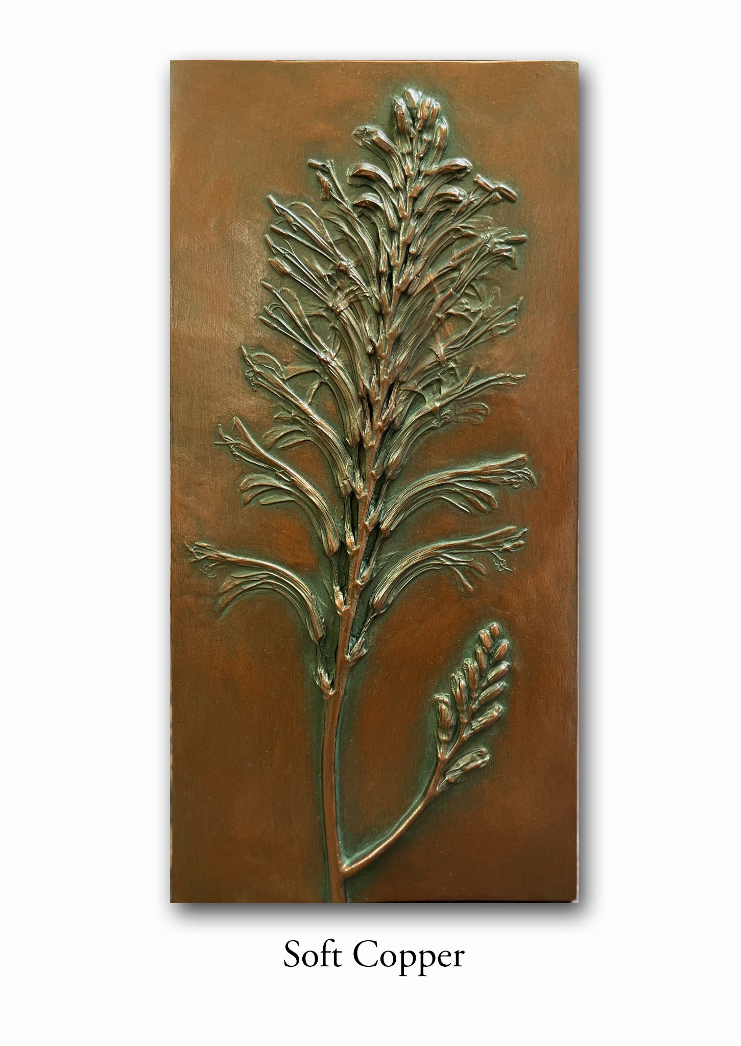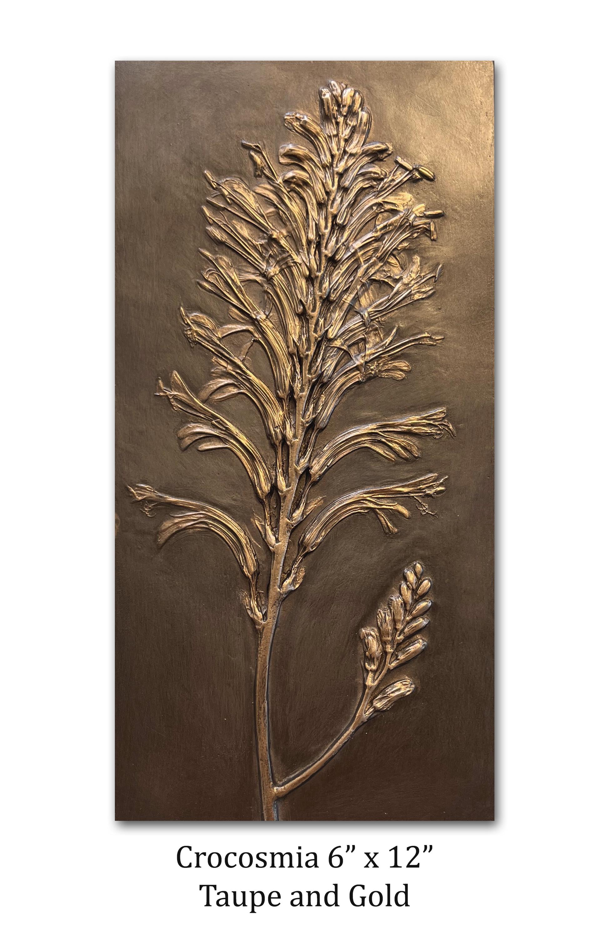 We usually see the Crocosmia in brilliant vermillion red but at Blindspot you can get them in sixteen unique patinas which highlight the intricate design. Our technique of using the actual plant shows the smallest detail including the pistils and stamens of this bright flower. Display this 6" x 12" on the wall or a stand and use it with one or two of our other flower panels.