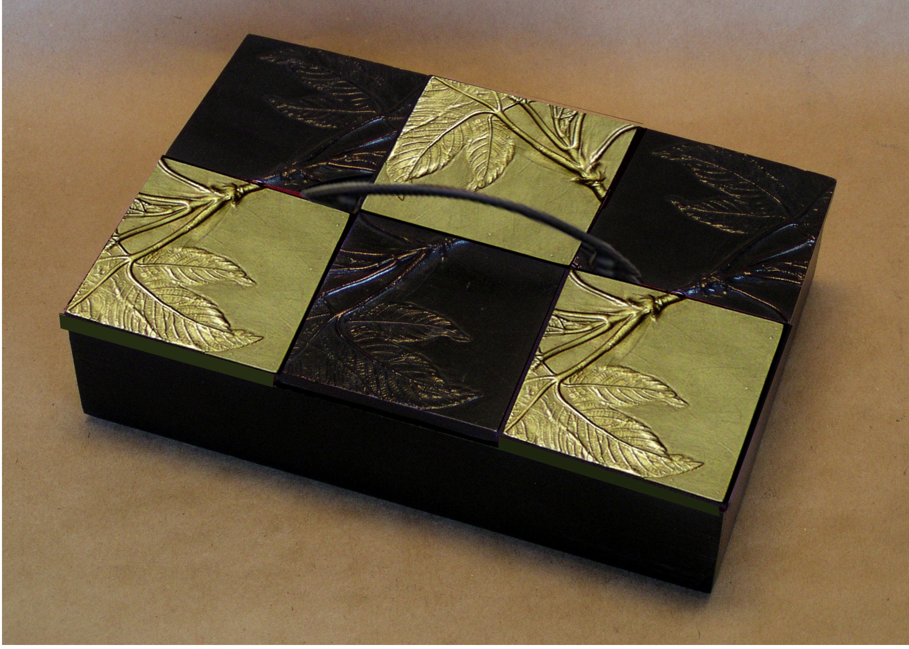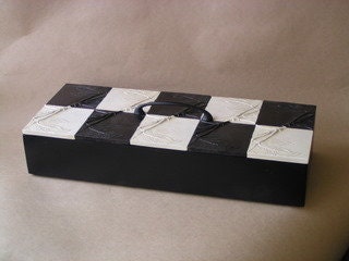 The California Buckeye is a favorite tree for several reasons. The explosion of bright green leaves as early as February, the mottled gray branches, the shiny seeds and best of all how it loses its leaves on a completely different schedule from other trees. Blindspot caught the winter burst of leaves in this small decorative box.The Buckeye Tile box is available in 4 sizes and many color combinations. We have used it to make fireplace surrounds and small mirrors as well. Choose from the list of ebony with another complimentary color. We create a checkerboard to store jewelry, watches or cuff links. If you prefer a single color or any combination not on the list send me an email and we will make it. How about " Purely Blue " with ebony?