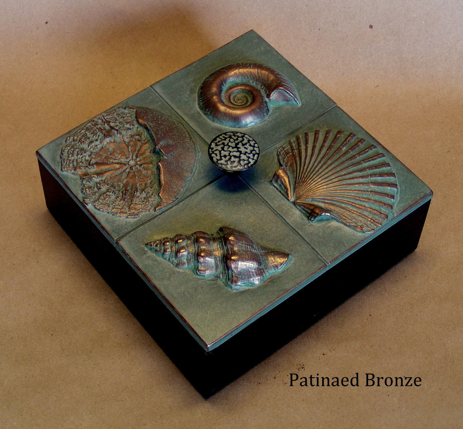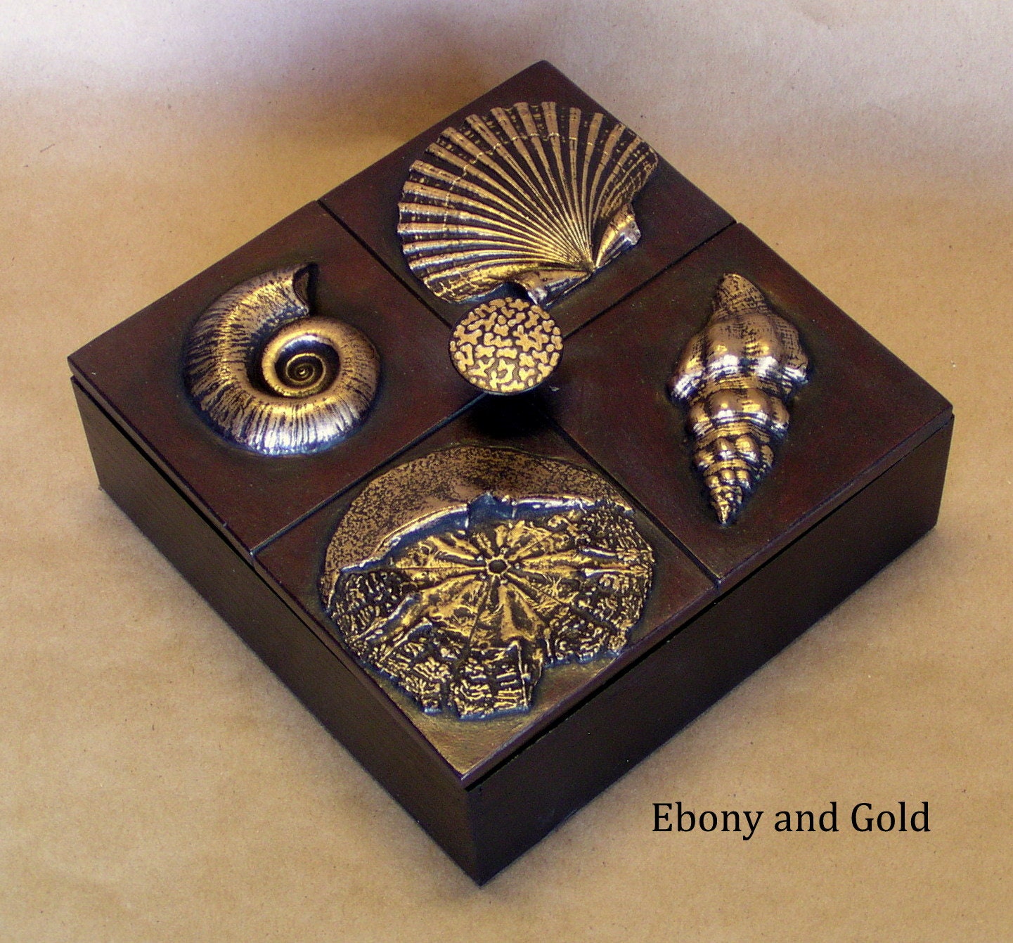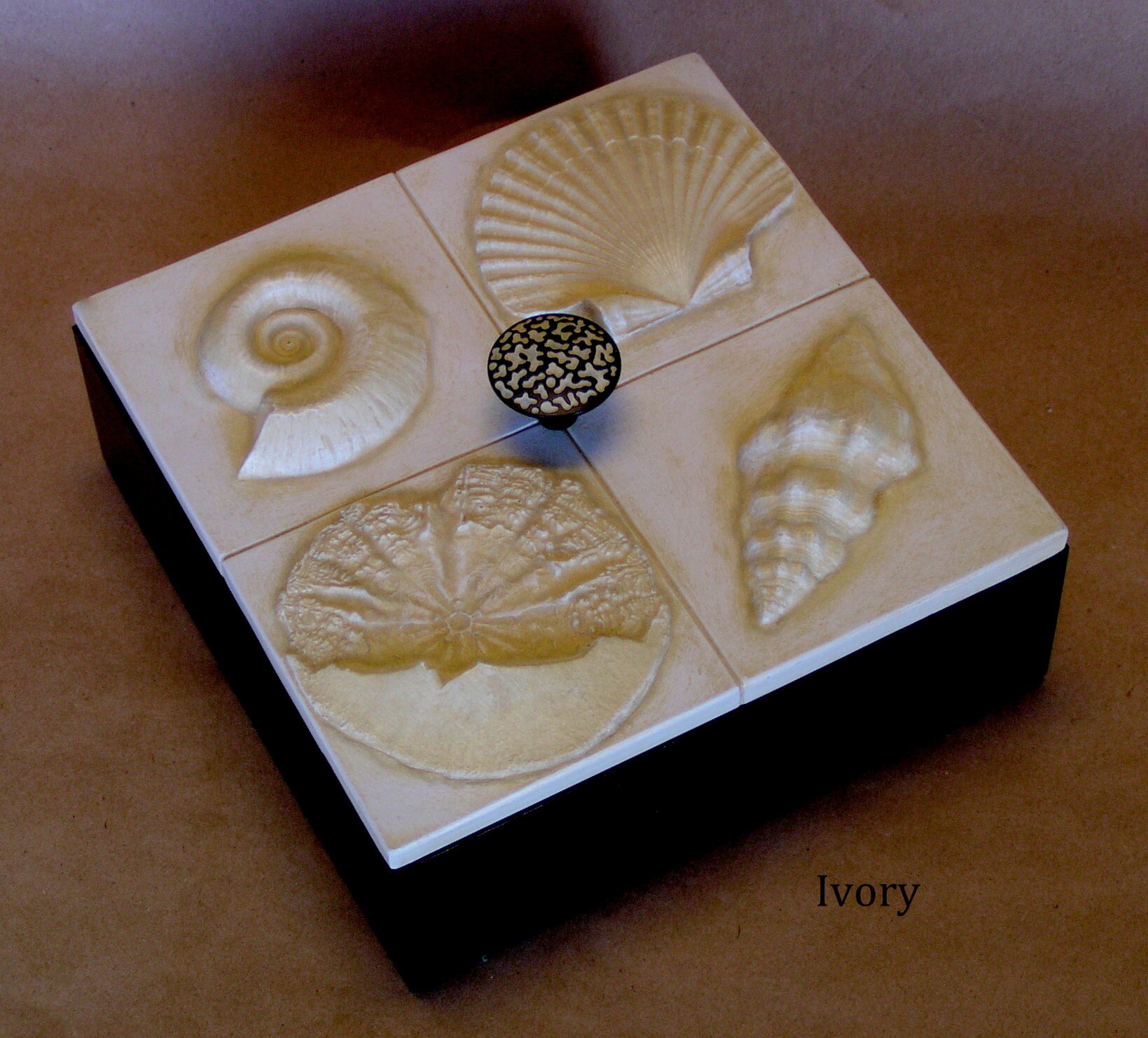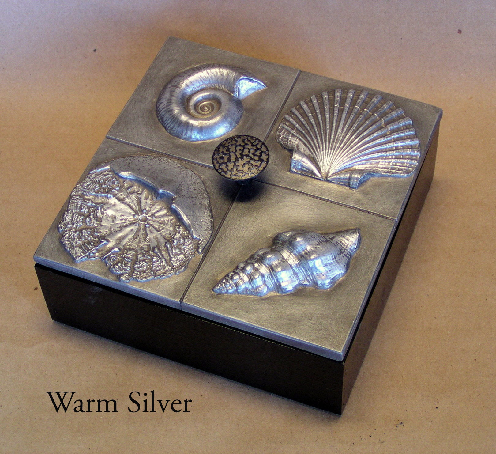 At Blindspot most of the natural objects we use are found while hiking the hills and walking the city streets. But for me the best place for a stroll comes with sand between my toes on the smell of ocean. To notice the elaborate inside of a broken sand dollar and the myriad of seaweed design is a joy. Winter is the best time to collect shells and seaweed on beach walks. BlindSpot uses real shells I find to create the molds for these decorative boxes. As a child my parents taught me to make dolls from kelp and always let me come home from the beach with pockets full of interesting rocks. It was a direct line to becoming a sculptor having a preoccupation with texture. The small size box is 6" x 6" and about 3" tall including the knob, with interior dimensions of 5 3/8" x 5 3/8" x 2". We use them to store jewelry, cocktail napkins and odds and ends. The box is made from bamboo and we make the lids in the studio using fiber reinforced gypsum cement. They are finished with natural shellac and metallic pigments and are available in sixteen colors and 2 sizes.
