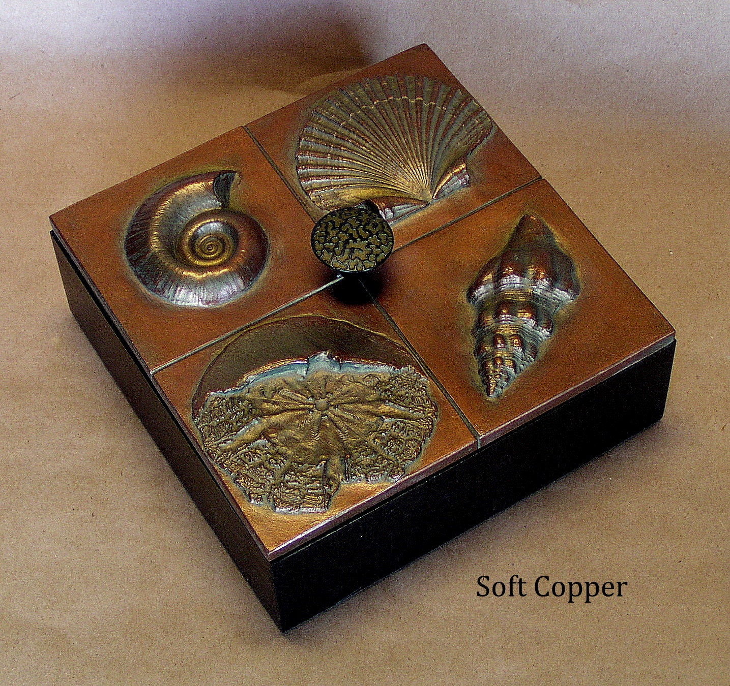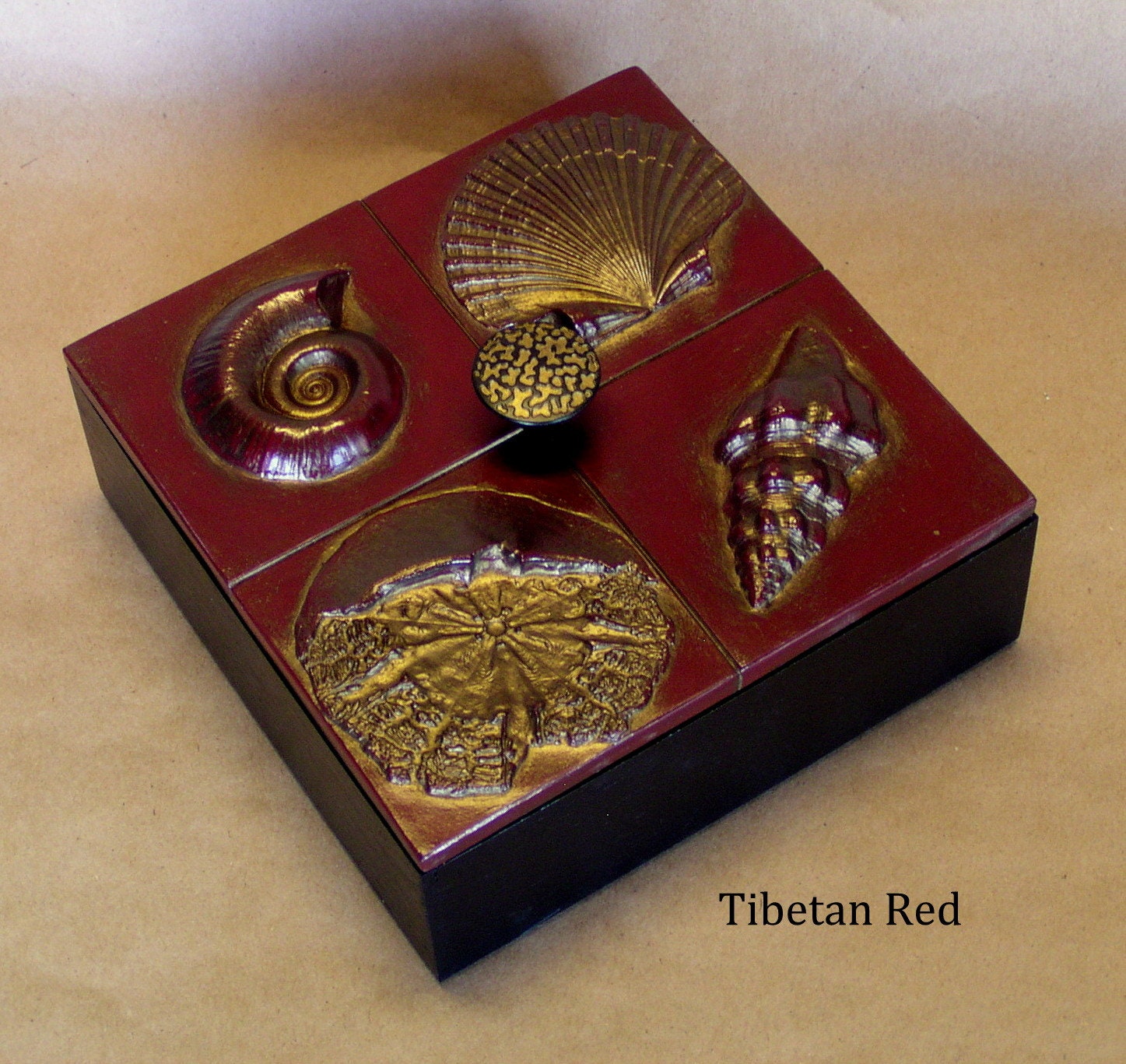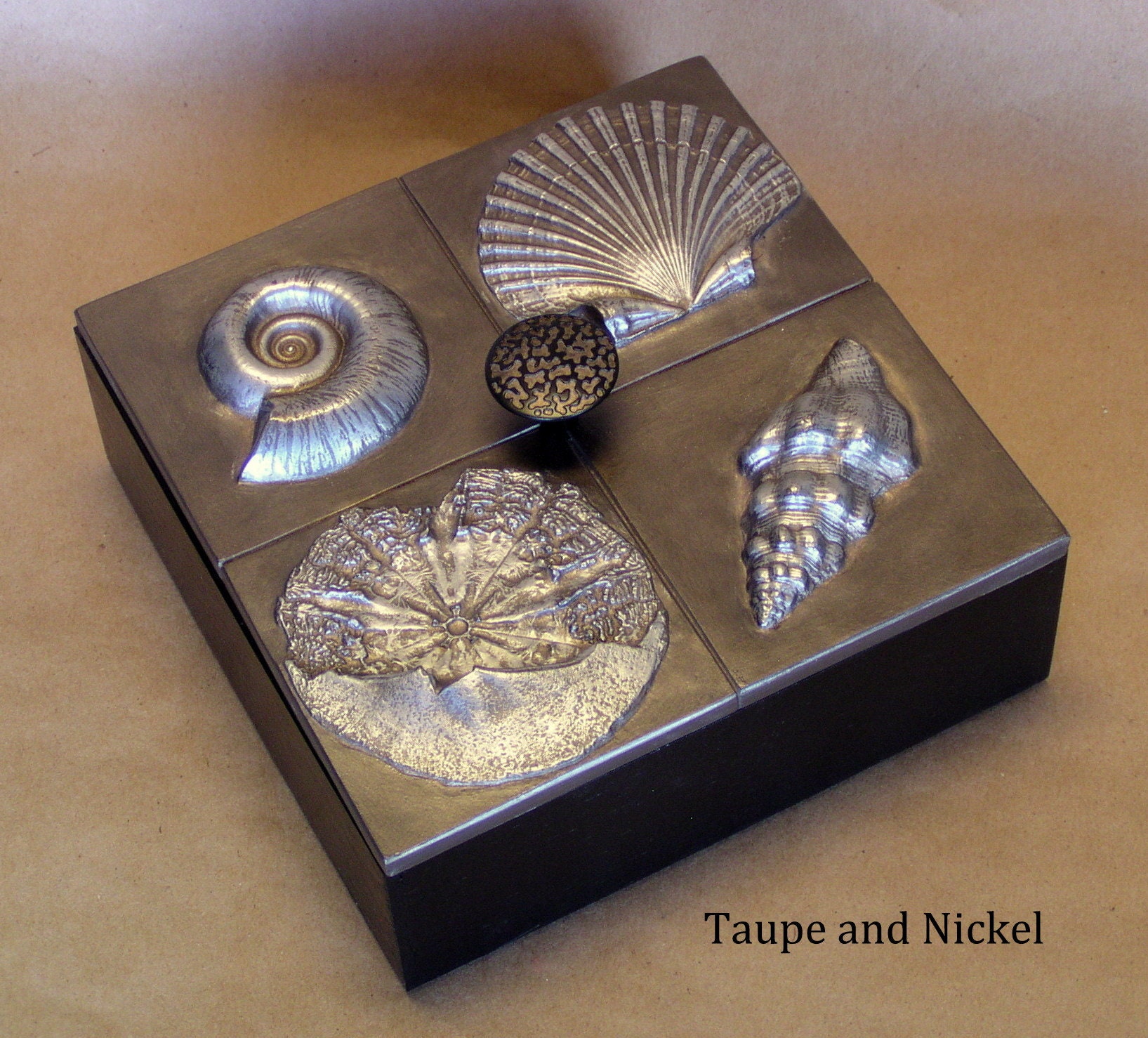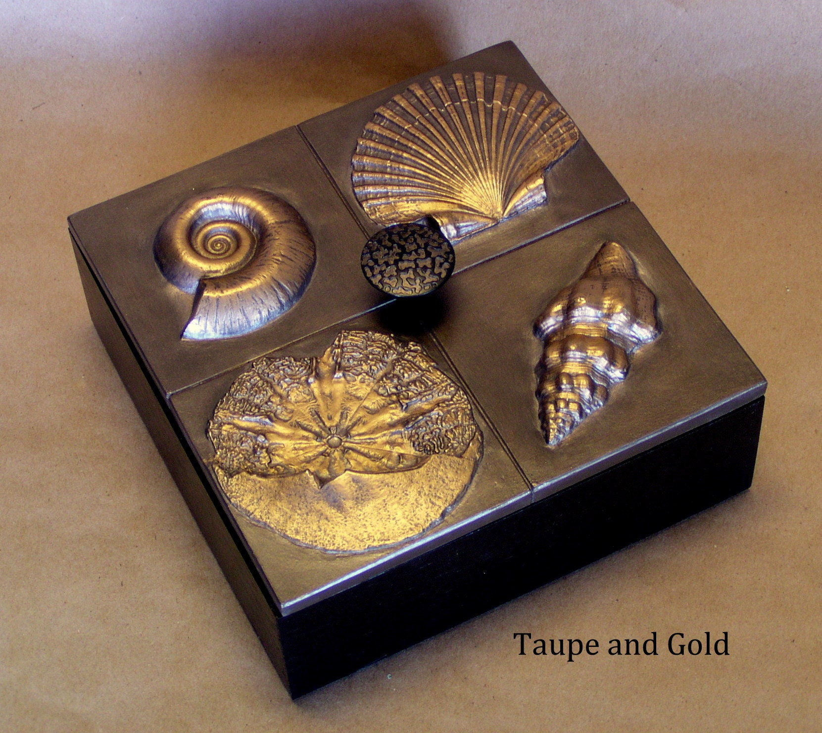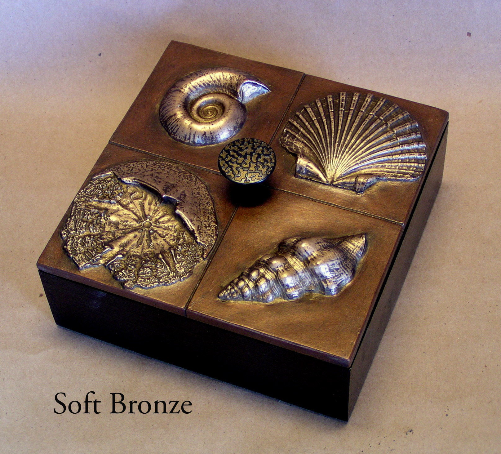 At Blindspot most of the natural objects we use are found while hiking the hills and walking the city streets. But for me the best place for a stroll comes with sand between my toes on the smell of ocean. To notice the elaborate inside of a broken sand dollar and the myriad of seaweed design is a joy. Winter is the best time to collect shells and seaweed on beach walks. BlindSpot uses real shells I find to create the molds for these decorative boxes. As a child my parents taught me to make dolls from kelp and always let me come home from the beach with pockets full of interesting rocks. It was a direct line to becoming a sculptor having a preoccupation with texture. The small size box is 6" x 6" and about 3" tall including the knob, with interior dimensions of 5 3/8" x 5 3/8" x 2". We use them to store jewelry, cocktail napkins and odds and ends. The box is made from bamboo and we make the lids in the studio using fiber reinforced gypsum cement. They are finished with natural shellac and metallic pigments and are available in sixteen colors and 2 sizes.