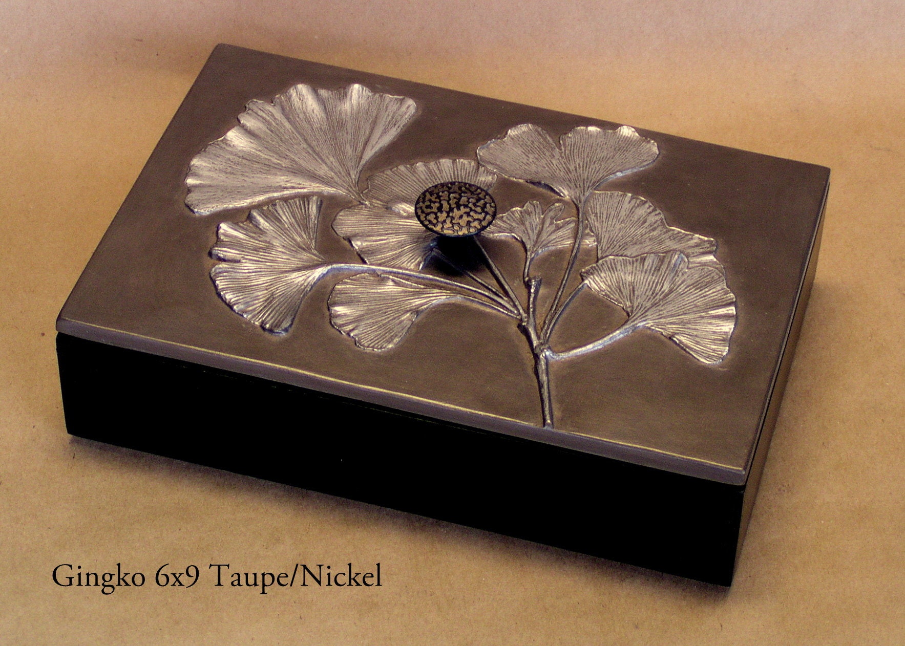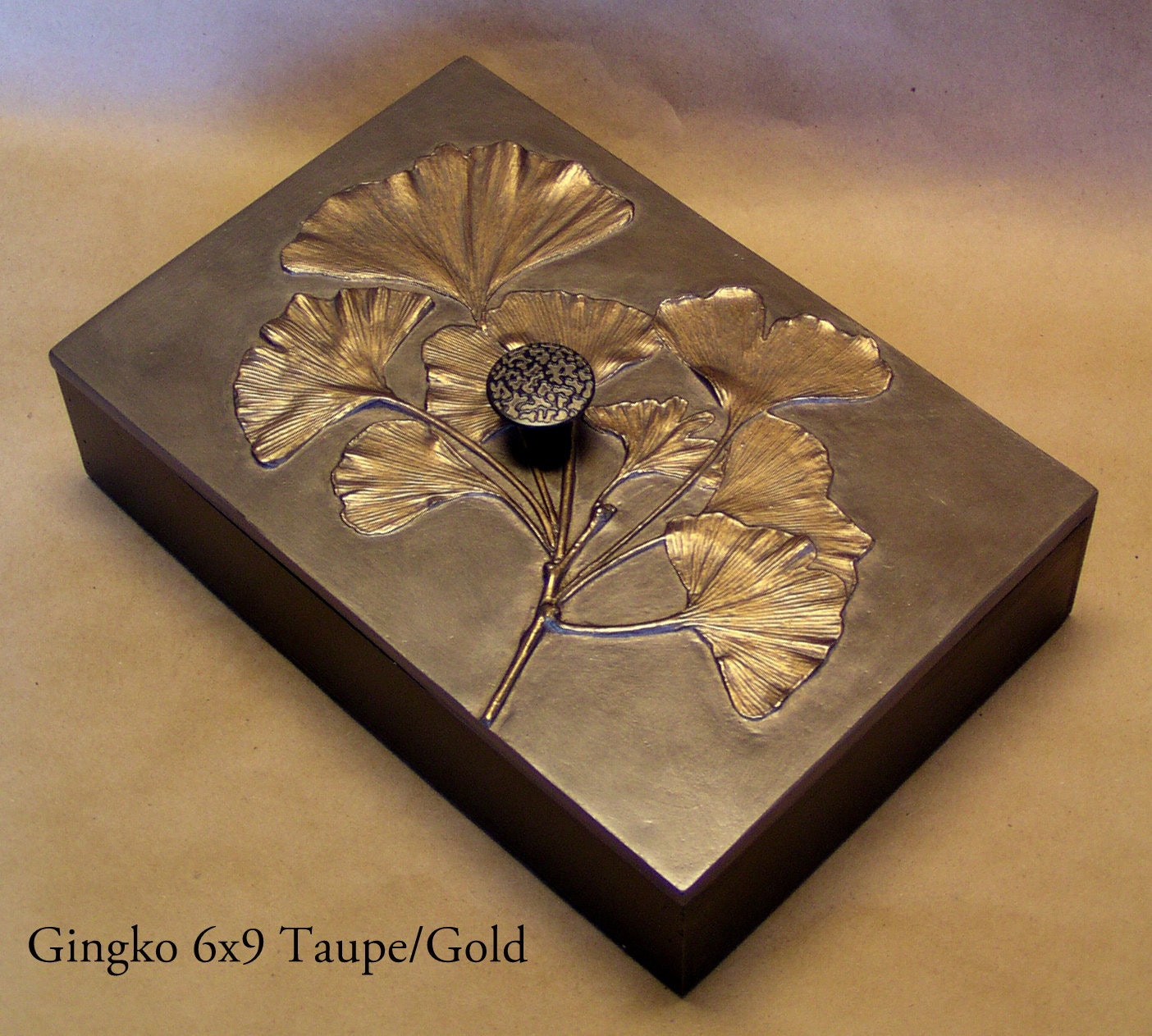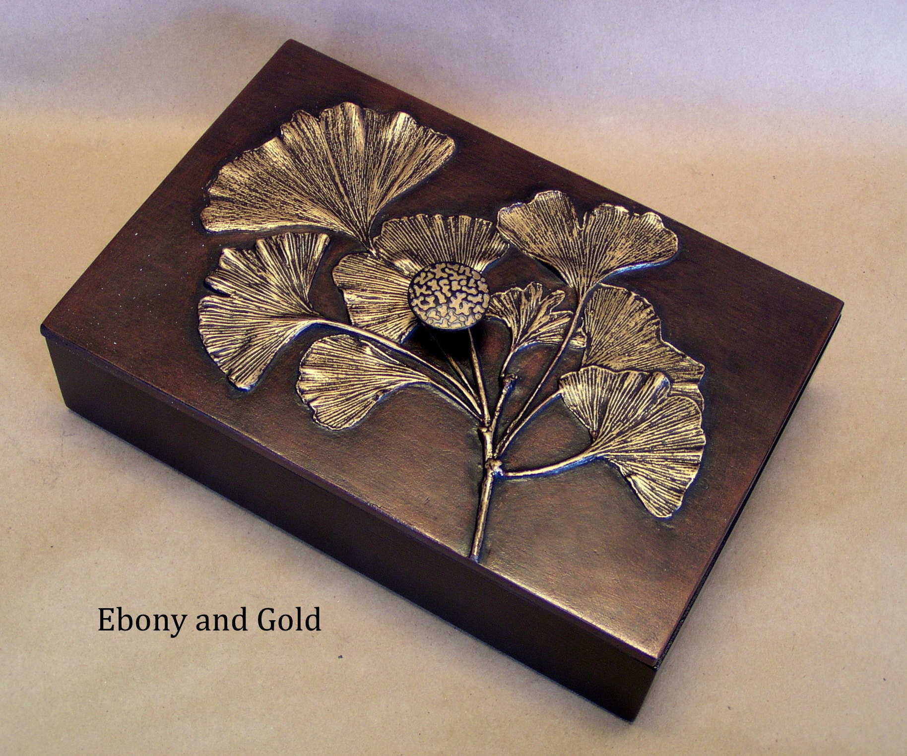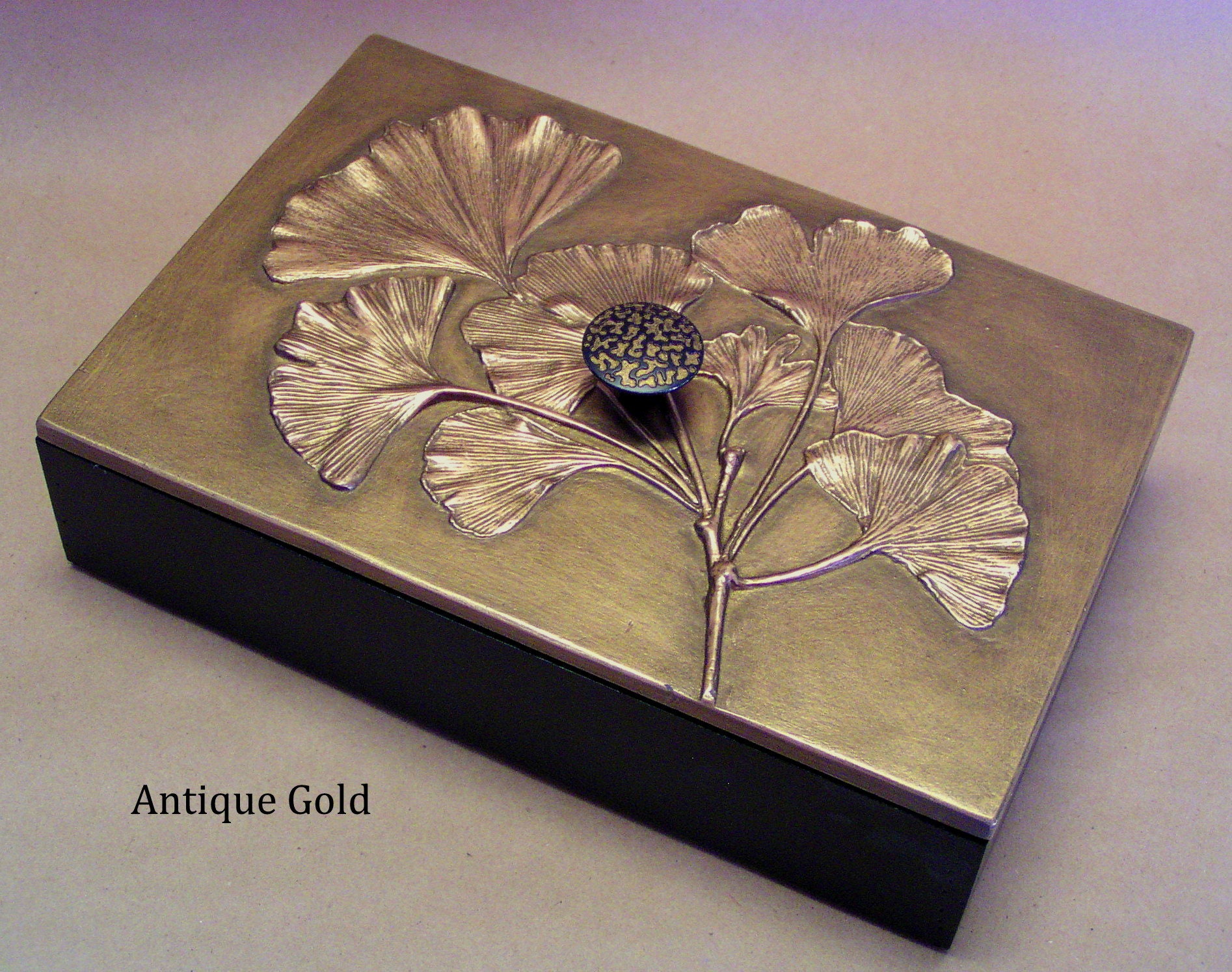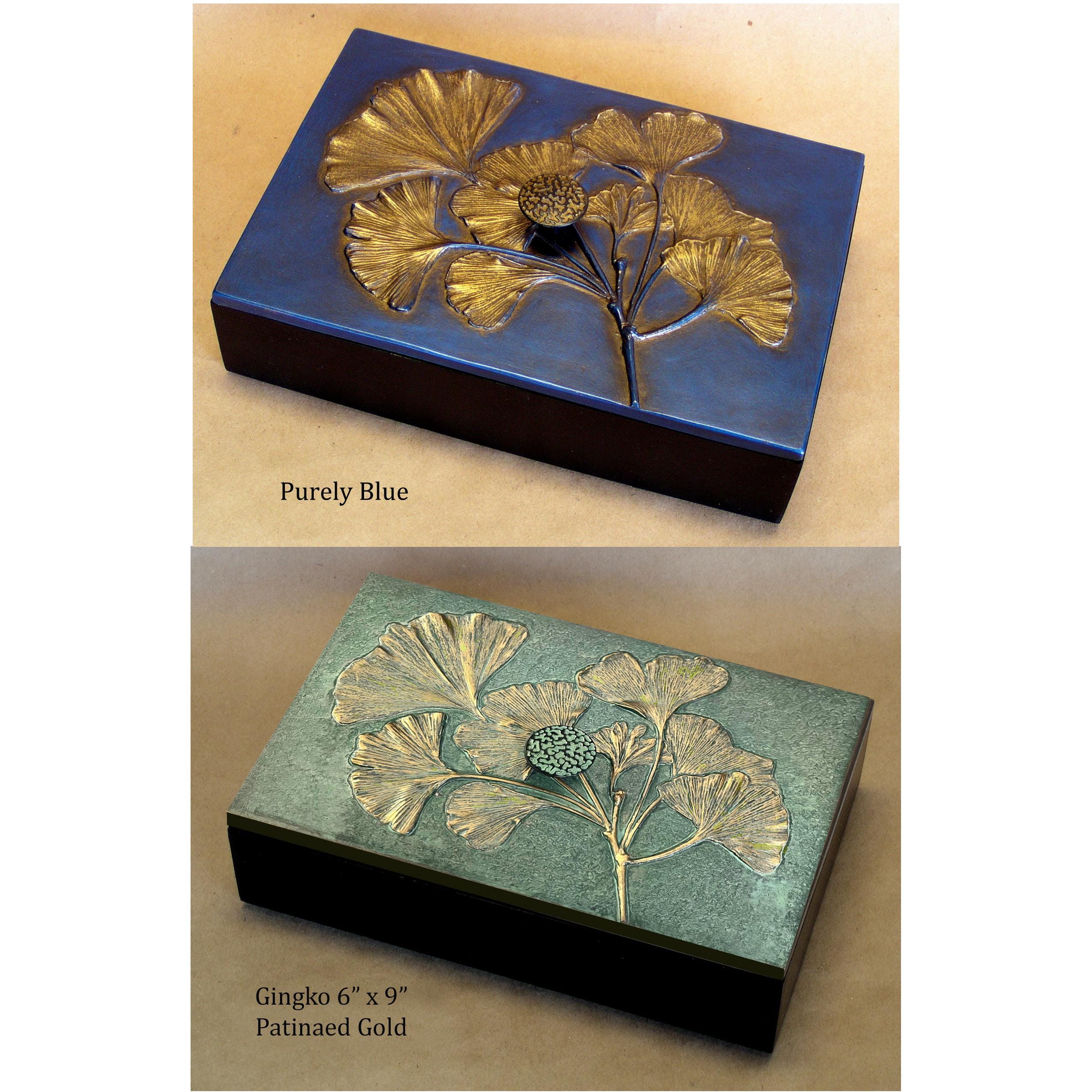 Directly from nature, Blindspot uses real leaves to create the molds for these decorative boxes. The large size is 6" x 9" and about 3" tall including knob, with interior dimensions of 5 3/8" x 8 3/8" x 2". We use them to store cocktail napkins, jewelry. cuff links, odds and ends. The box is made from bamboo and we make the lids in the studio using fiber reinforced gypsum cement. They are finished with natural shellac and metallic pigments. Available in sixteen special patinas. Interested in a color not shown on the list like the beautiful "Purely Blue"? Just contact me with your request, I can probably oblige. We have hundreds of colors. All the items using the Gingko leaf were made from an original 11" x 20" panel that I made for my mother about 20 years ago. I just used the branches from the tree to make impressions, then I cast a panel that had only branches. On this positive I used the actual leaves glued on with some additional trickery and made a mold directly over the leaves. Using this method I was able to get better dimension on the leaves and really show the beautiful veins. The ginkgo leaf symbolizes longevity, resilience, and peace.