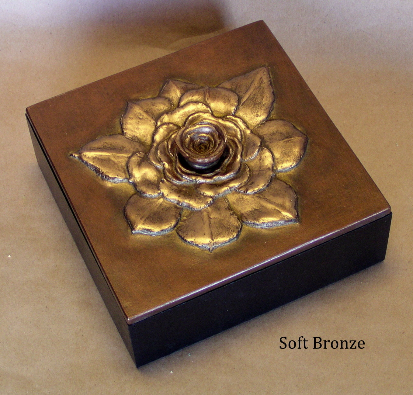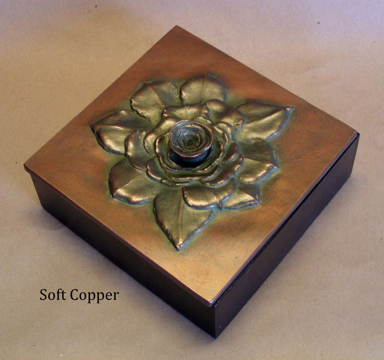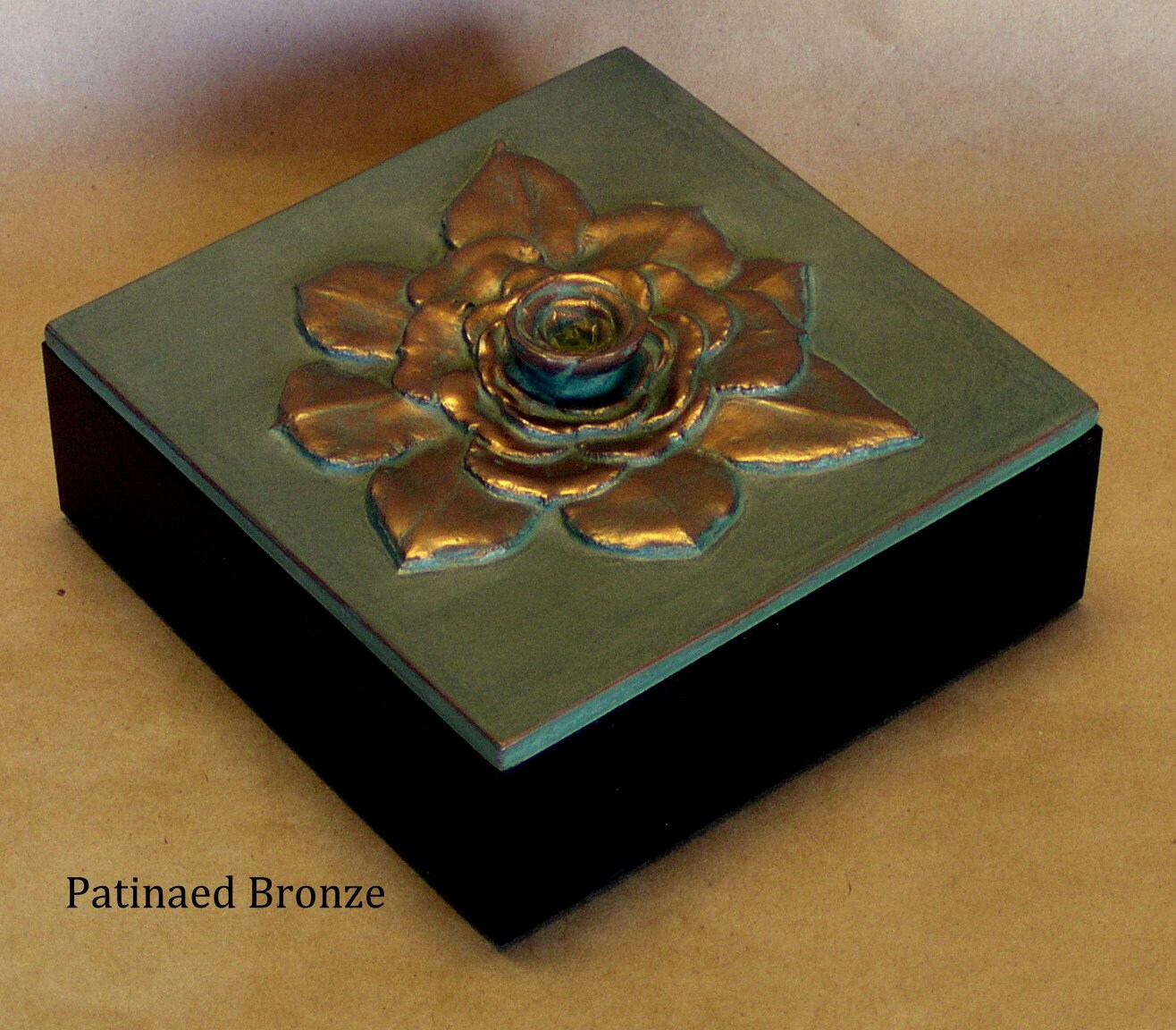 Our 6" x 6" square Succulent box was made from the out of control aeoniums that were threatening to take over the front planter. We have controlled it here using the center as the handle. Resembling a rose or a huge gardenia we can color it in any of sixteen unique metallic patinas,