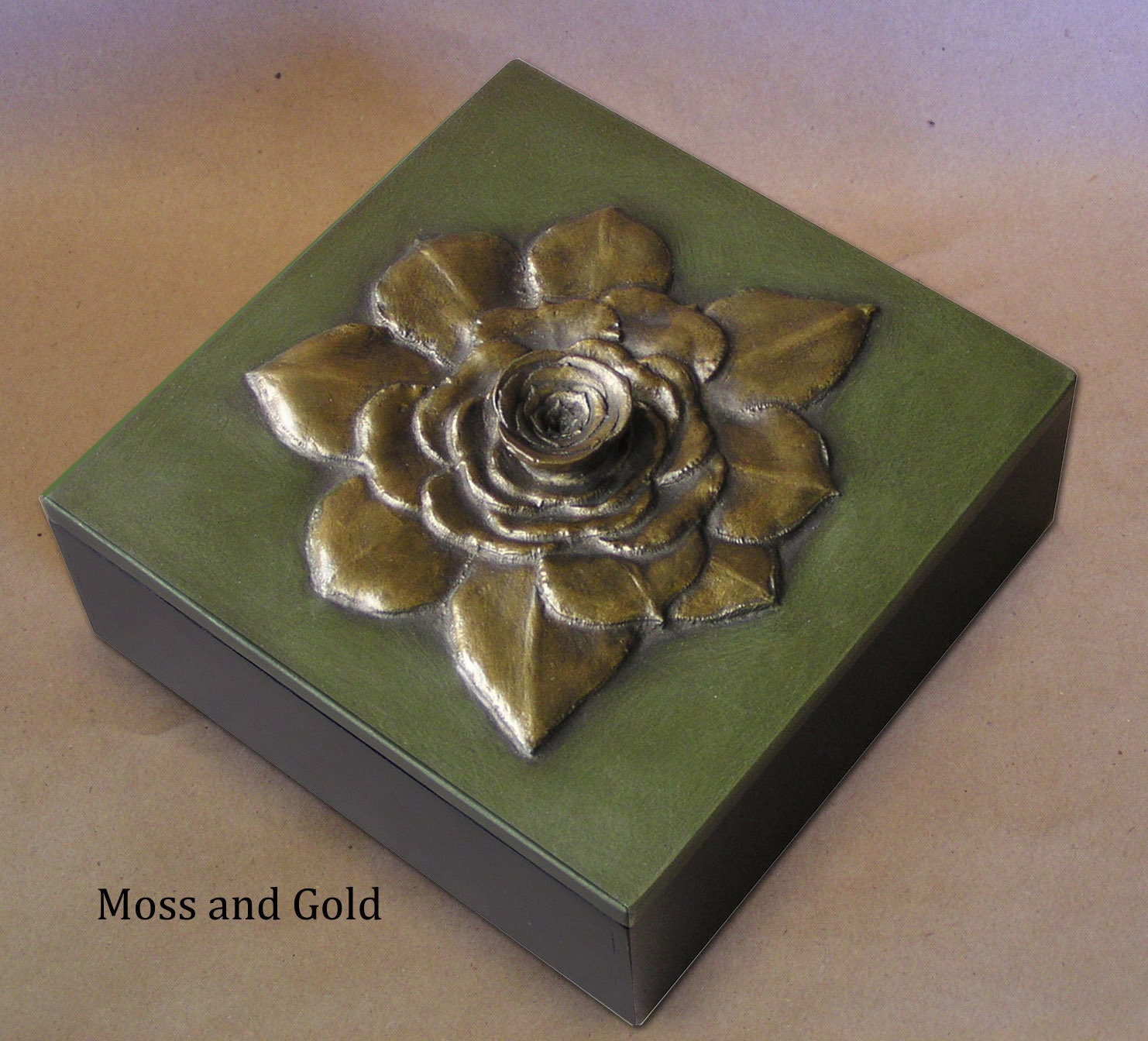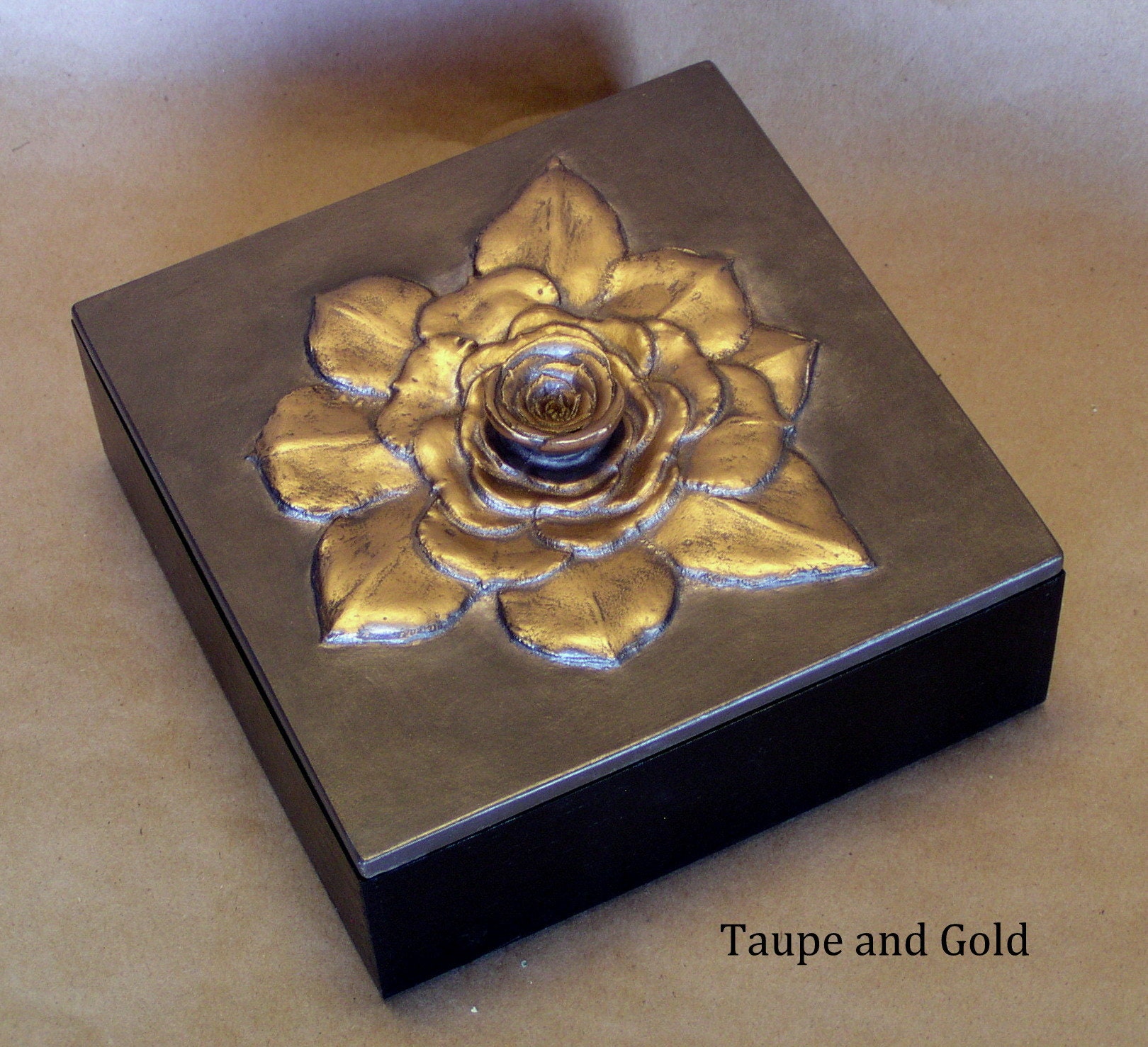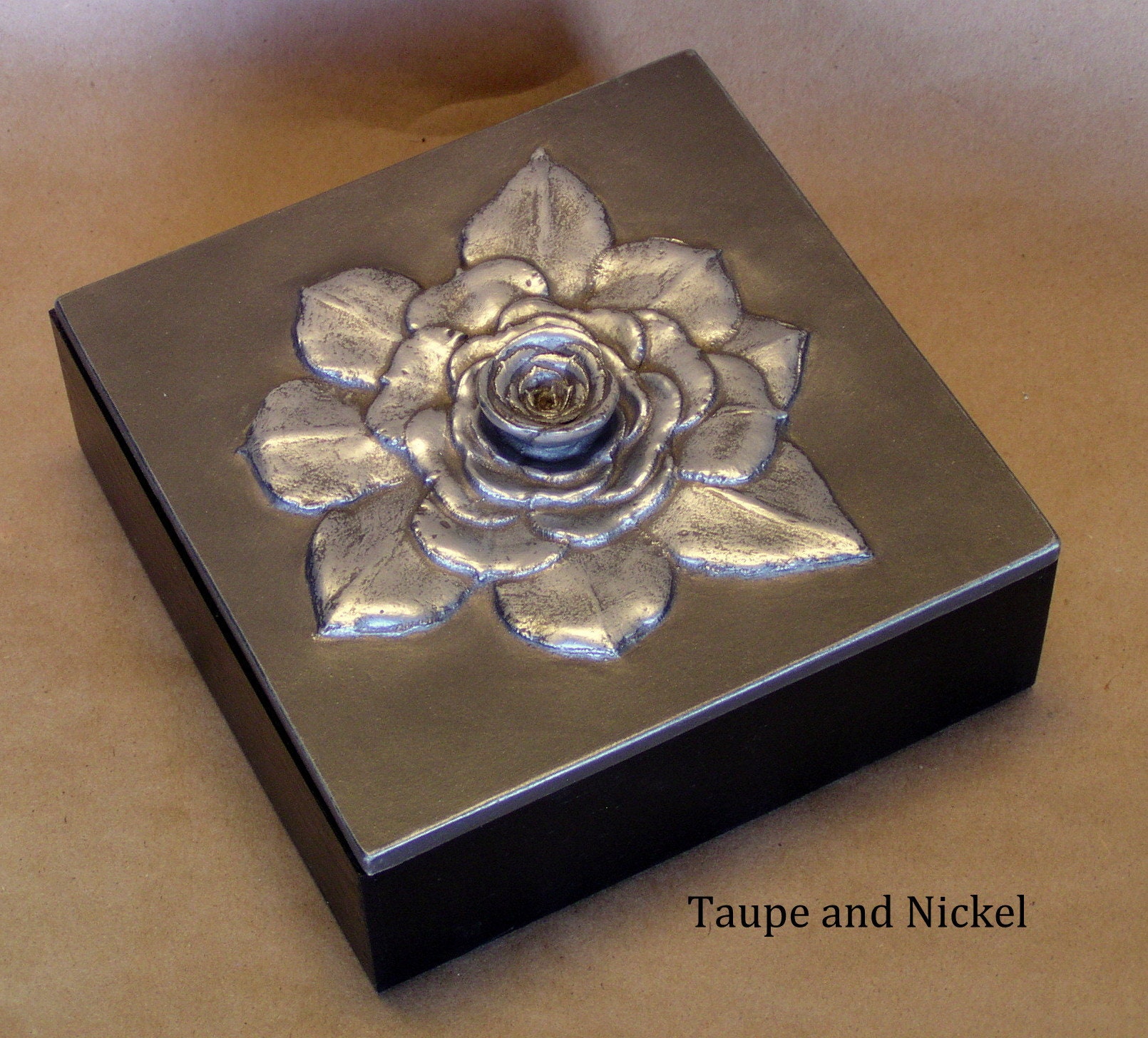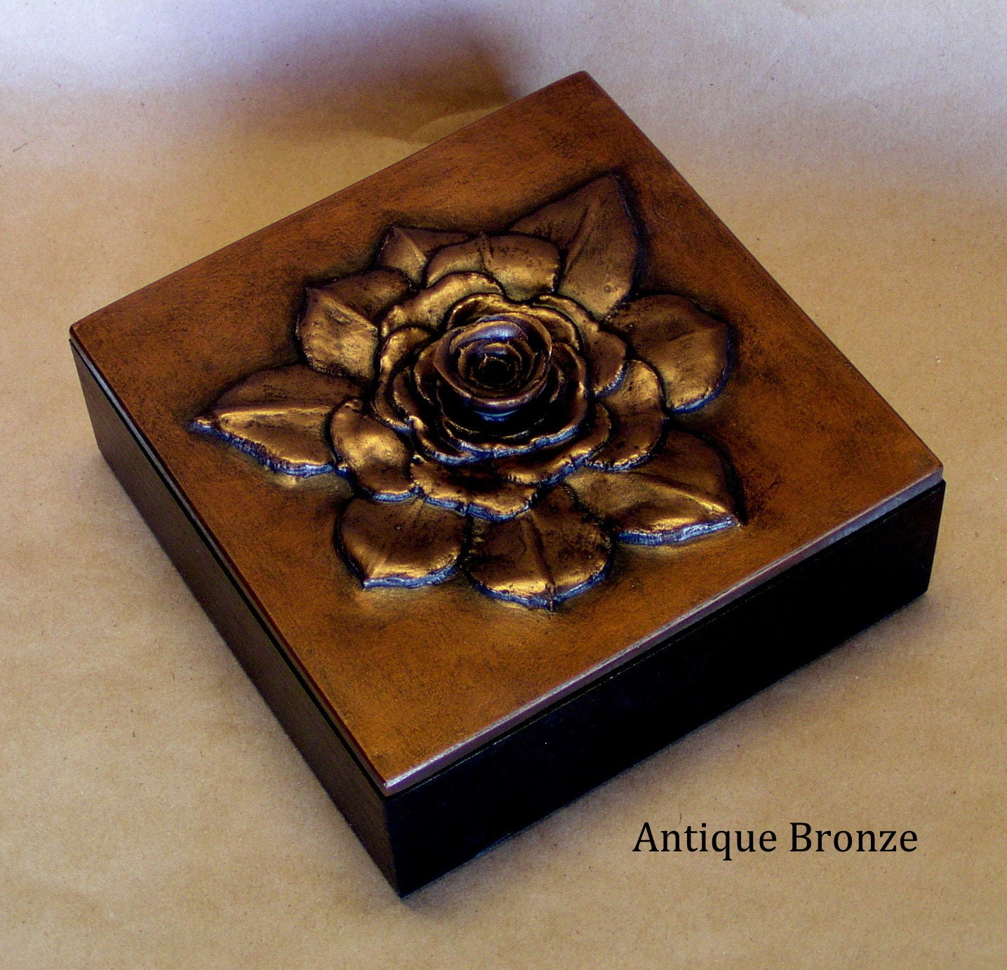 Our 6" x 6" square Succulent box was made from the out of control aeoniums that were threatening to take over the front planter. We have controlled it here using the center as the handle. Resembling a rose or a huge gardenia we can color it in any of sixteen unique metallic patinas,