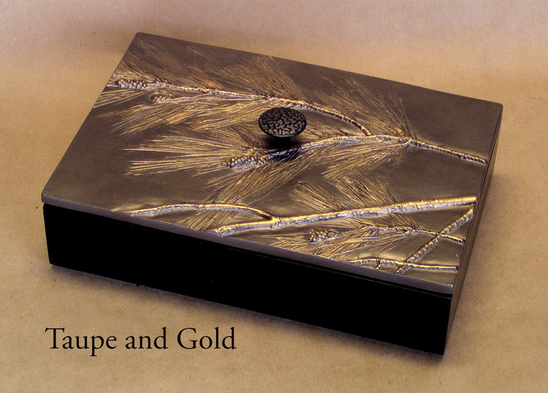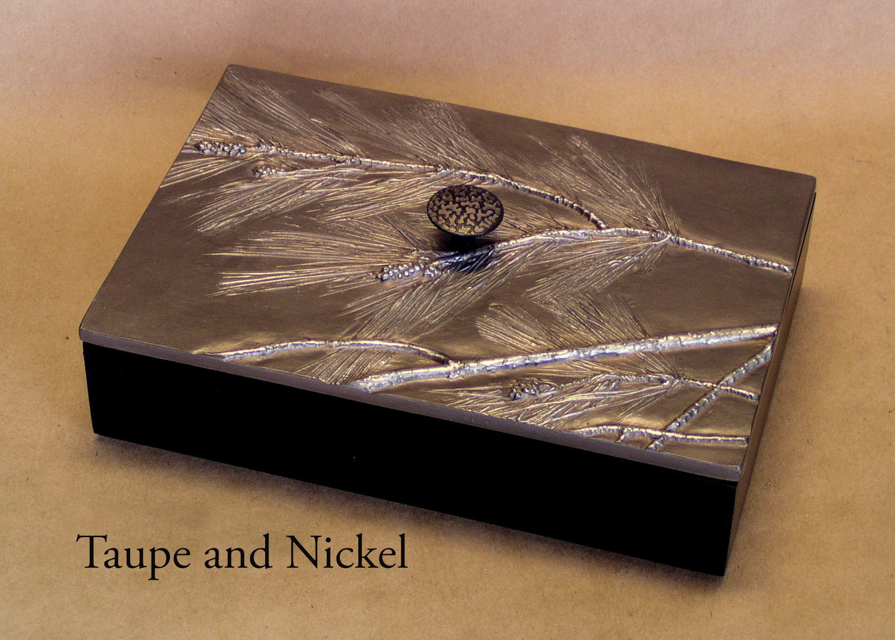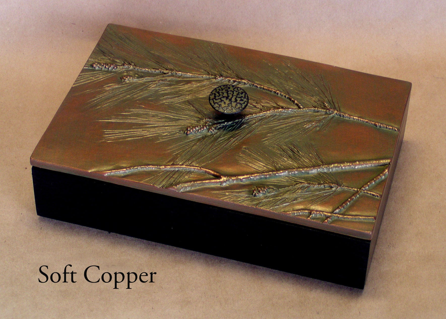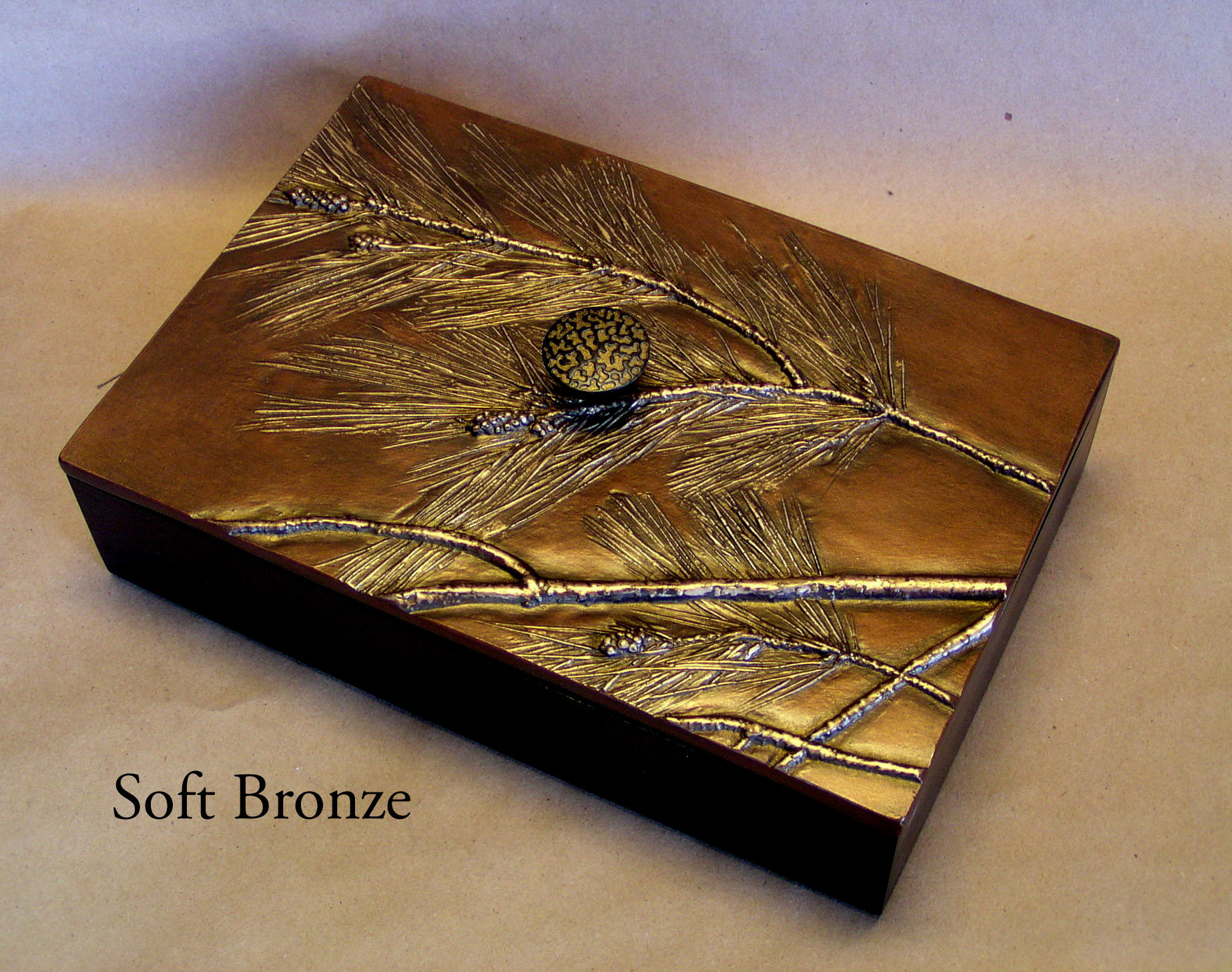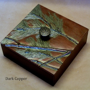 Unfortunately the Pine Tree that I used to make the impressions for this box has been cut down. Everything about it was perfect except I guess its roots were a problem. I have searched for a similar Pine with no luck. The 6" x 9" box has interior dimensions of 5 3/8" x 8 3/8"x 2" (not quite large enough for a Pine cone).