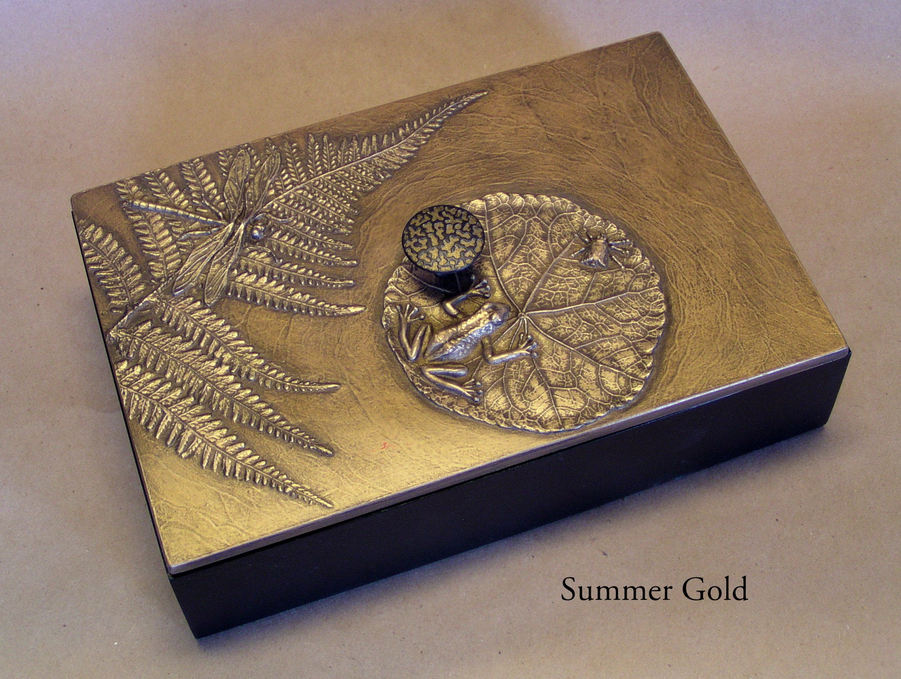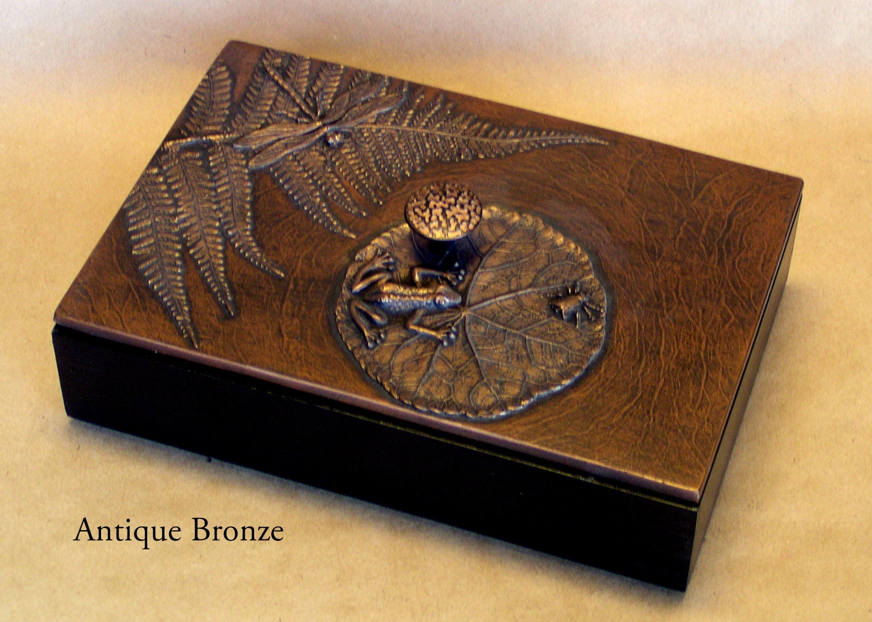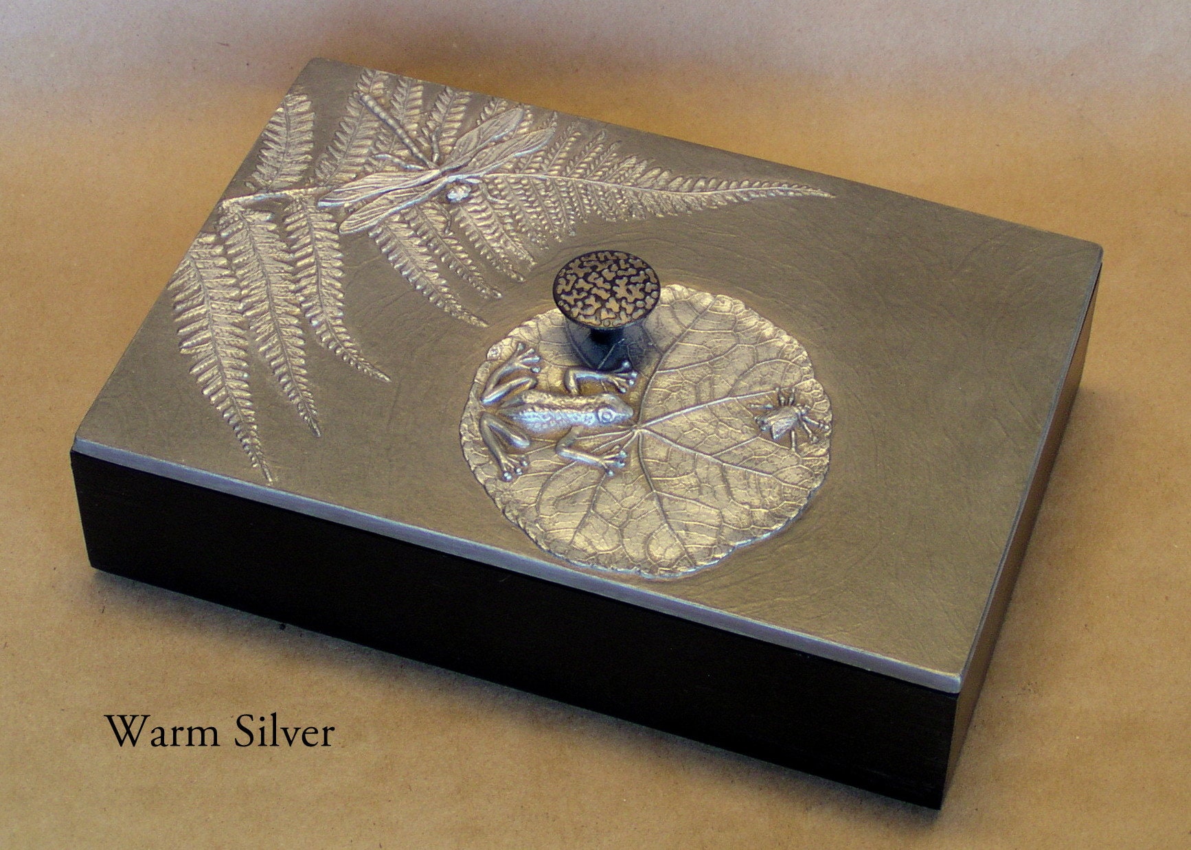 When I first began making mirror frames using found objects, my son was very young. He had a collection of plastic animals and monsters. He and his friends (with my encouragement) made a series of "monster medallions". The tiny monster mirror I made became one of the first items I sold. Stealing his plastic animals was addictive and eventually led to the Frog Pond box. He is now in his 30's but still brings me beautiful things like the kelp from the ocean to use. We use real leaves, but not real frogs or dragonflies to create molds for our unique botanical box lids. The 6" x 6" box will hold jewelry or cocktail napkins and is available in any of our sixteen unique patinas.