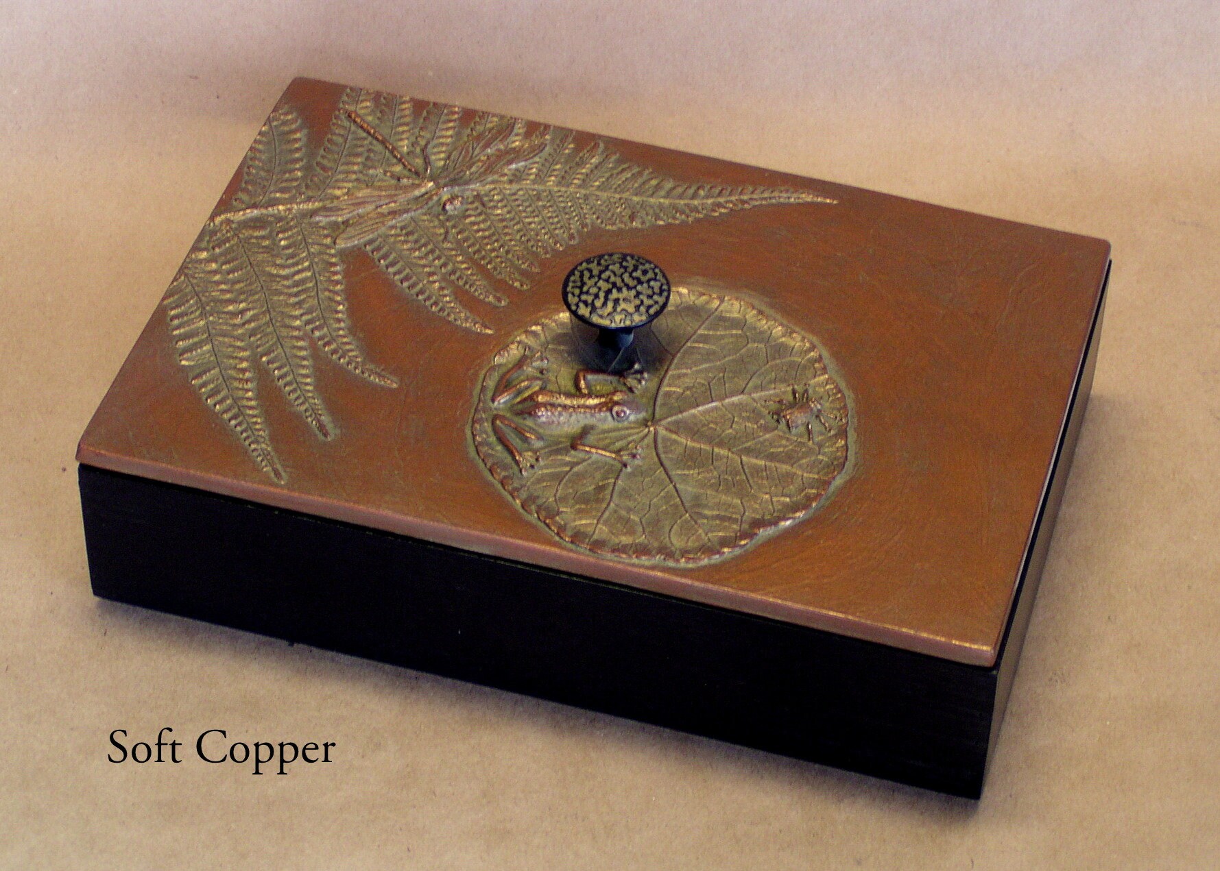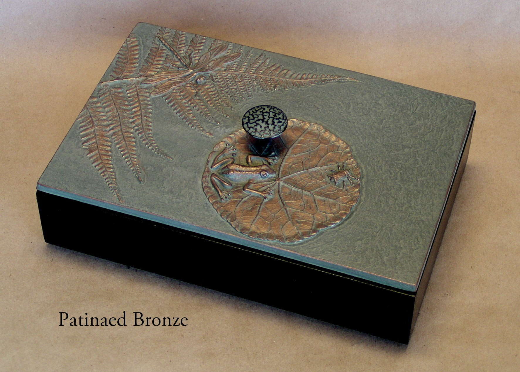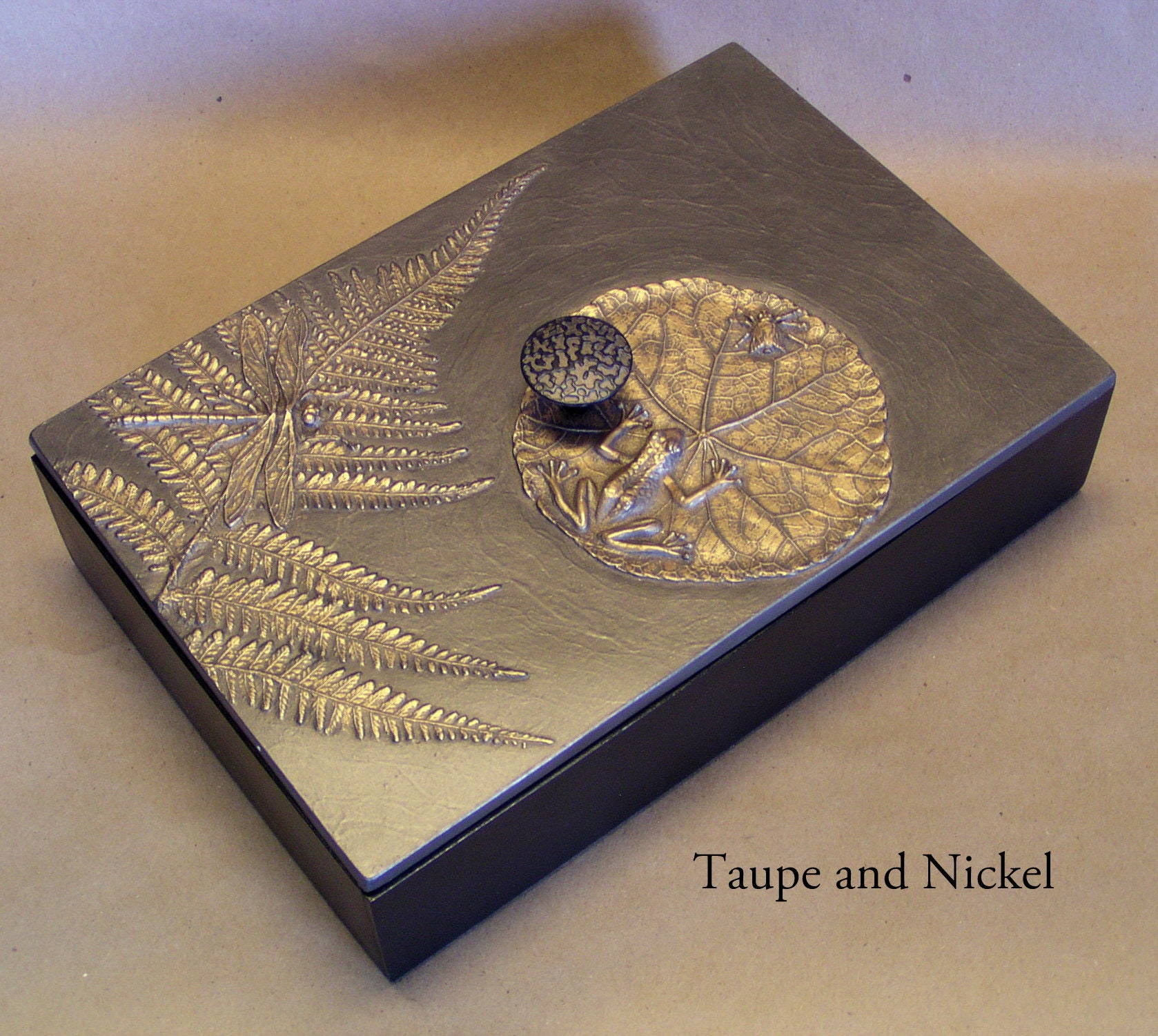 When I first began making mirror frames using found objects, my son was very young. He had a collection of plastic animals and monsters. He and his friends (with my encouragement) made a series of "monster medallions". The tiny monster mirror I made became one of the first items I sold. Stealing his plastic animals was addictive and eventually led to the Frog Pond box. He is now in his 30's but still brings me beautiful things like the kelp from the ocean to use. We use real leaves, but not real frogs or dragonflies to create molds for our unique botanical box lids. The 6" x 6" box will hold jewelry or cocktail napkins and is available in any of our sixteen unique patinas.