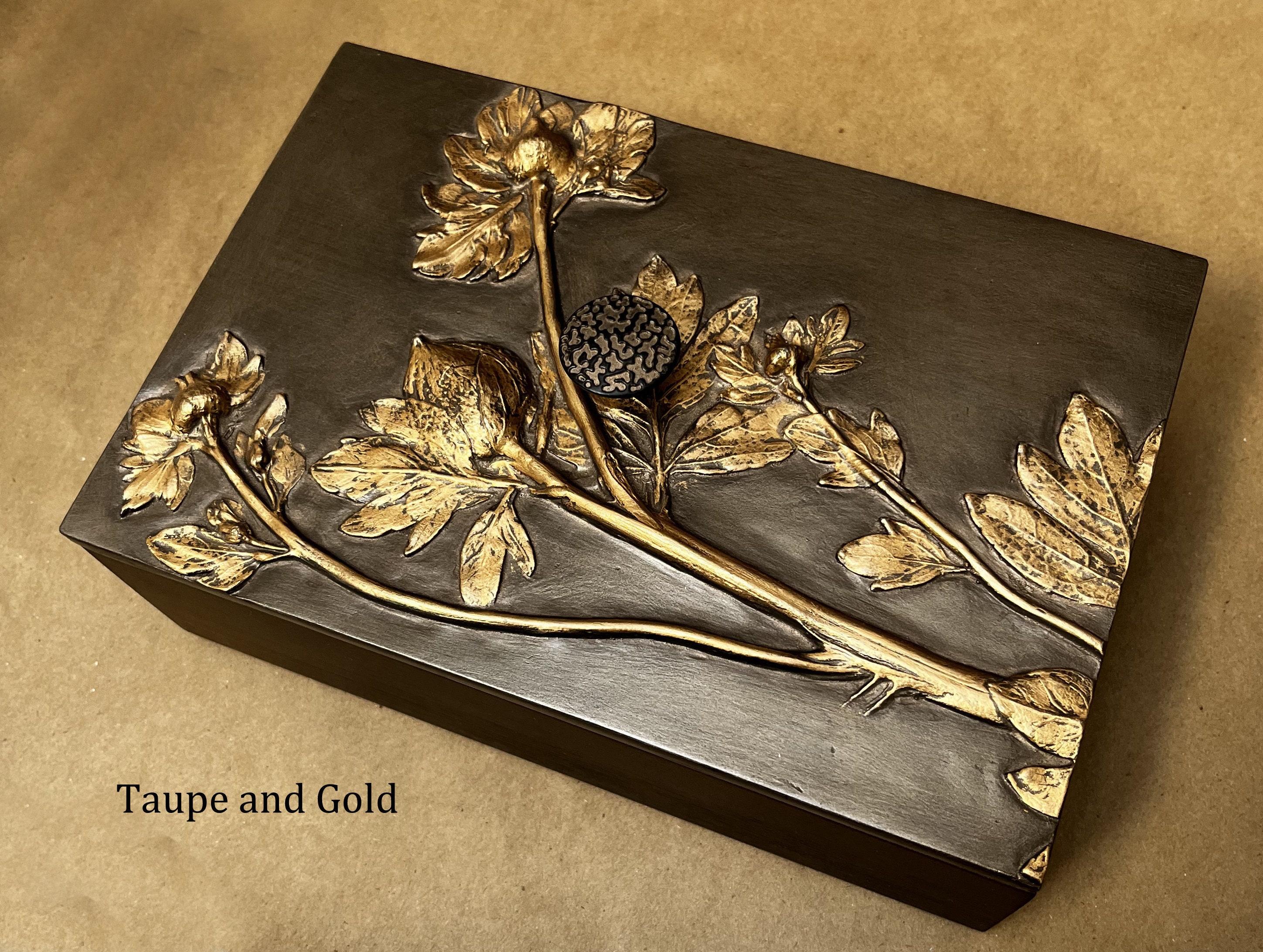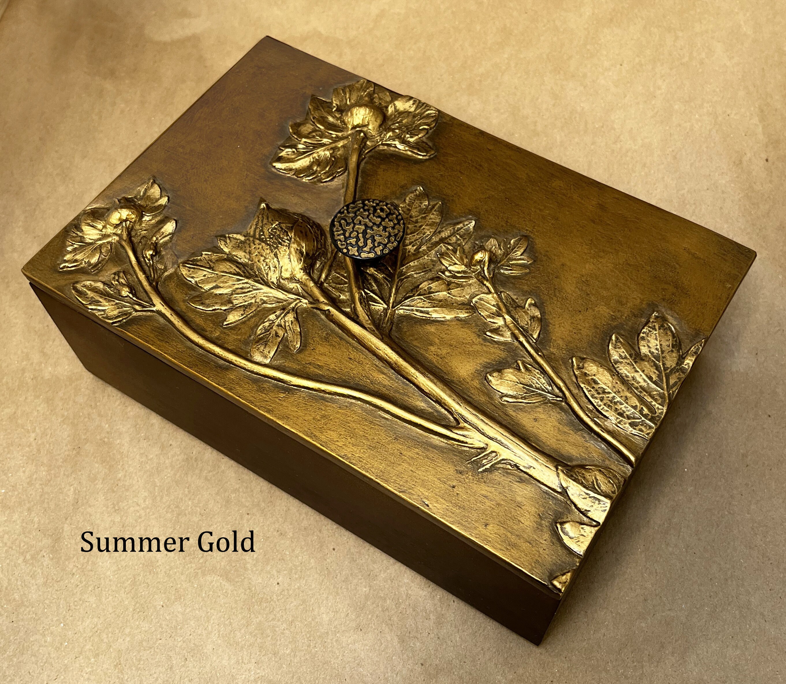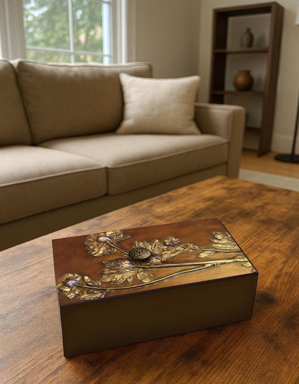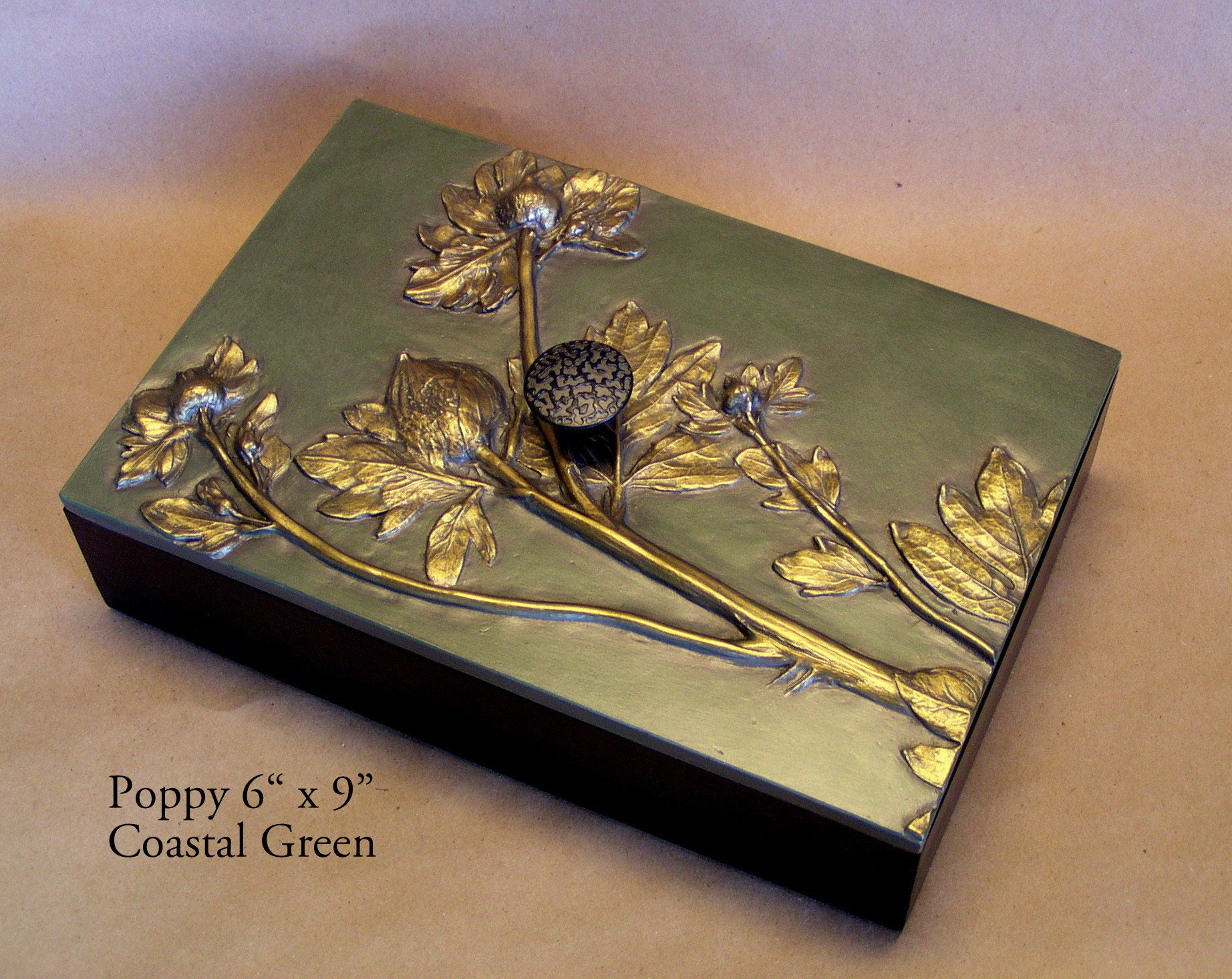At BlindSpot we enjoy finding unusual things to use for our small decorative storage boxes. The buds of the California native Matilija Poppy are complex and a bit hairy. Being a California native myself, I admire the tall plant with the huge white flowers. Some call it a Fried Egg, but Matilija has 3 dotted letters and I love that. The size is 6" x 9" and about 3" tall including the knob. The interior dimensions are 5 3/8" x 8 3/8" x 2". It is available in sixteen unique metallic patinas. If you are interested in a custom size please see my listing called Custom Size Box. Then send me a message about the size that would best suit your needs.
