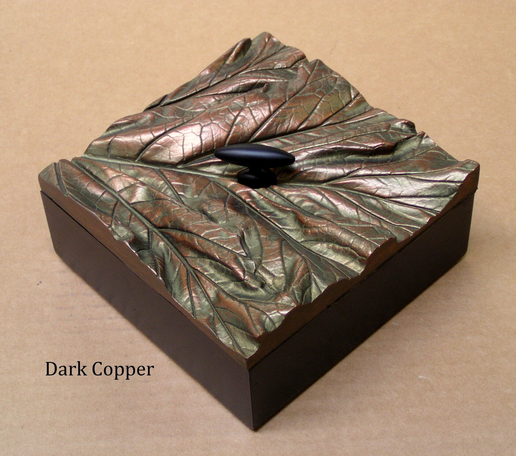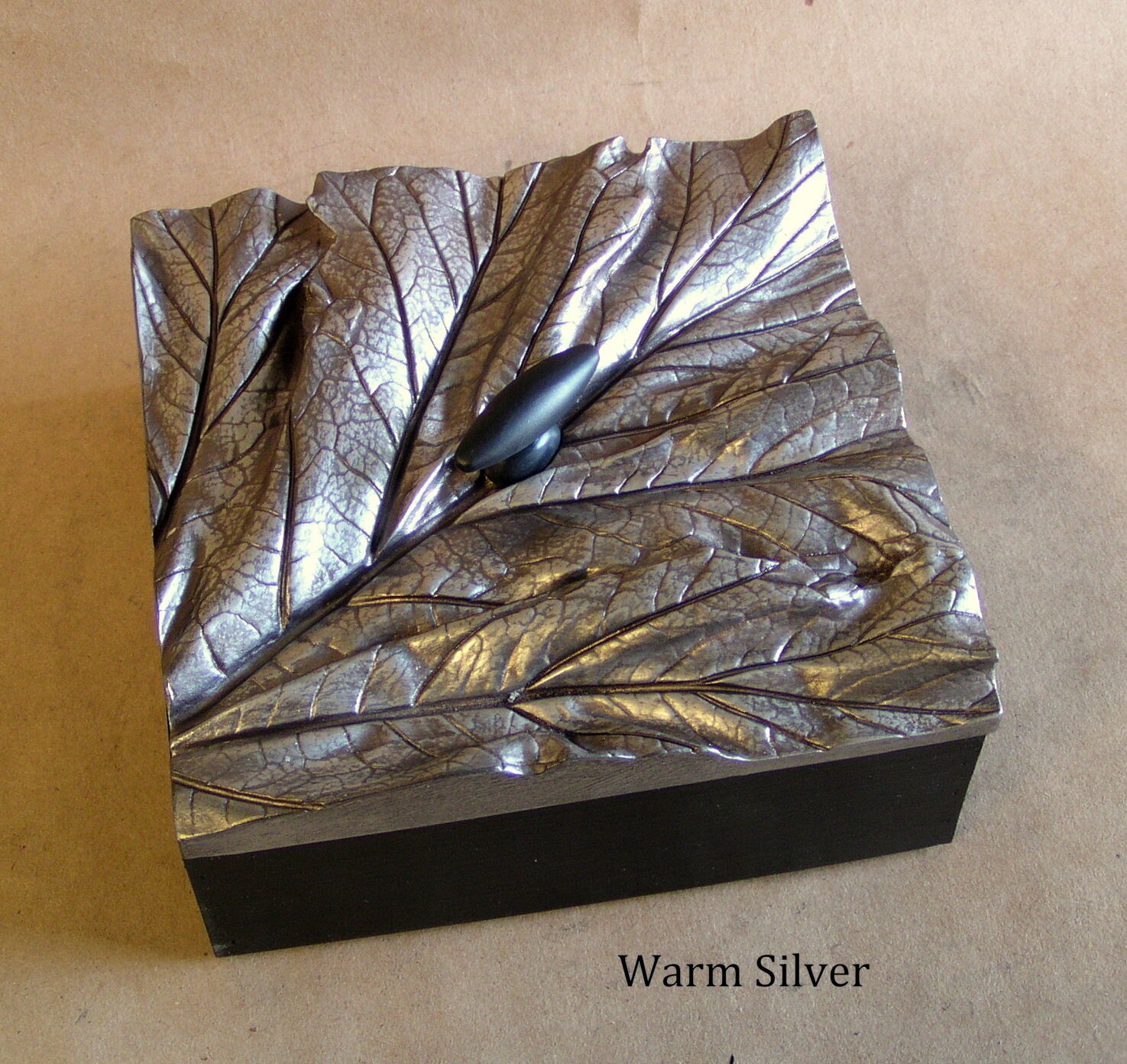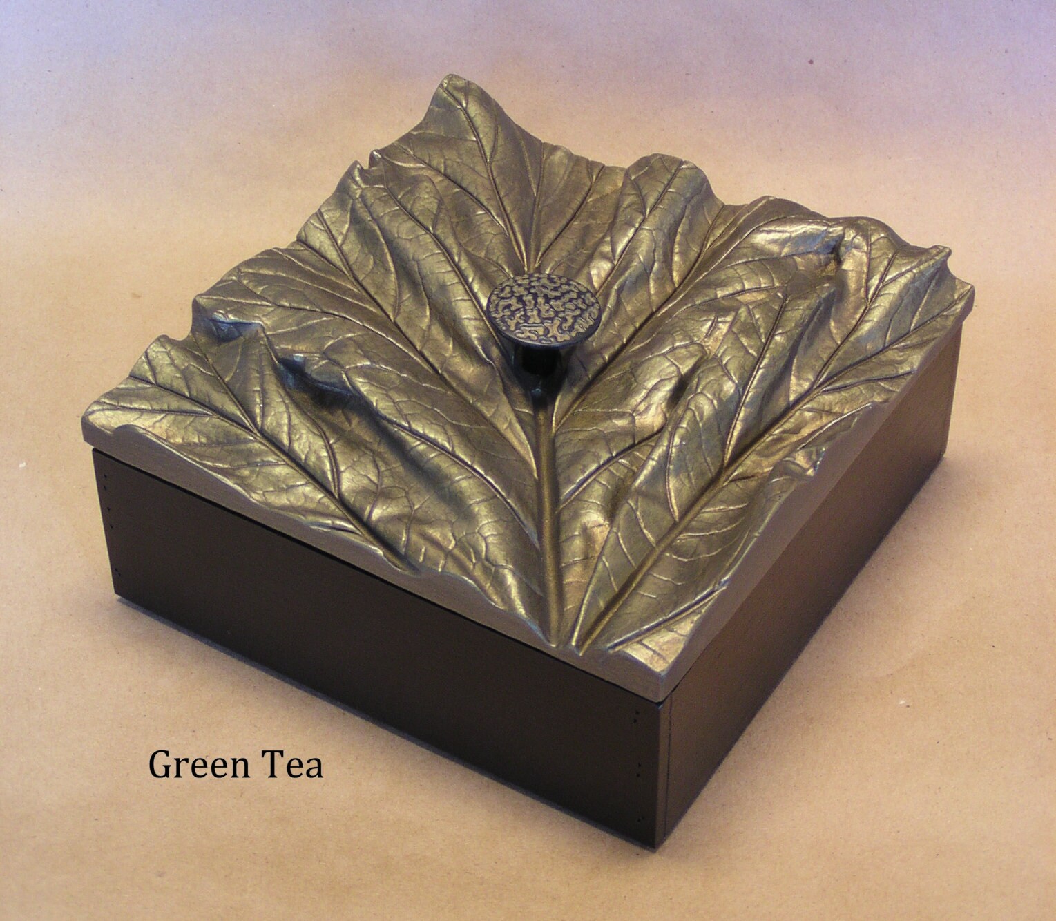 I made a mold using a two part process of a convoluted leaf of the acanthus making this our most 3 dimensional lid. The giant leaves of the acanthus have been used in design for centuries but this is a contemporary interpretation. This is actually the reverse of the leaf so that the deep veins would take the darker patina and the raised areas could be highlighted. Sometimes the mold making process is a two or three step affair. Since many items are too delicate to make good impressions we use a couple of tricks to get the desired result. On a number of items featuring leaves we like to emphasize the veins by showing them in the negative rather than the positive. And with others like the kelp we end up making rubber kelp because in its natural state it is too wet and slippery to press into the clay.