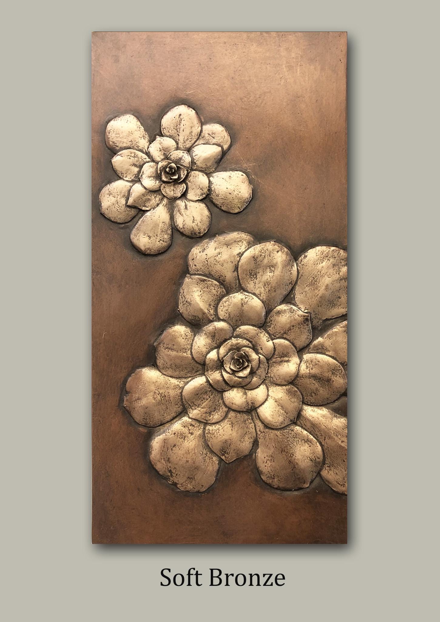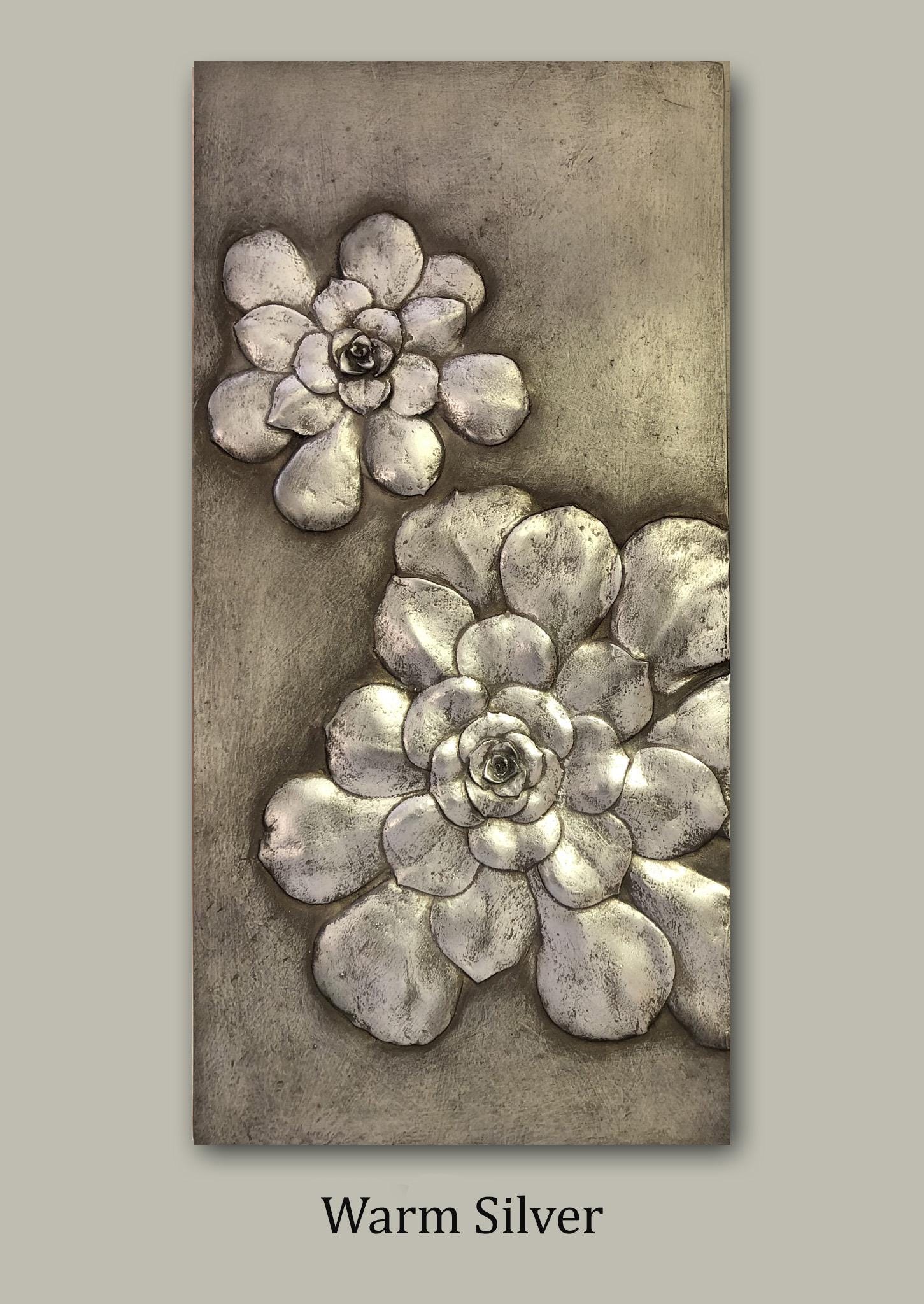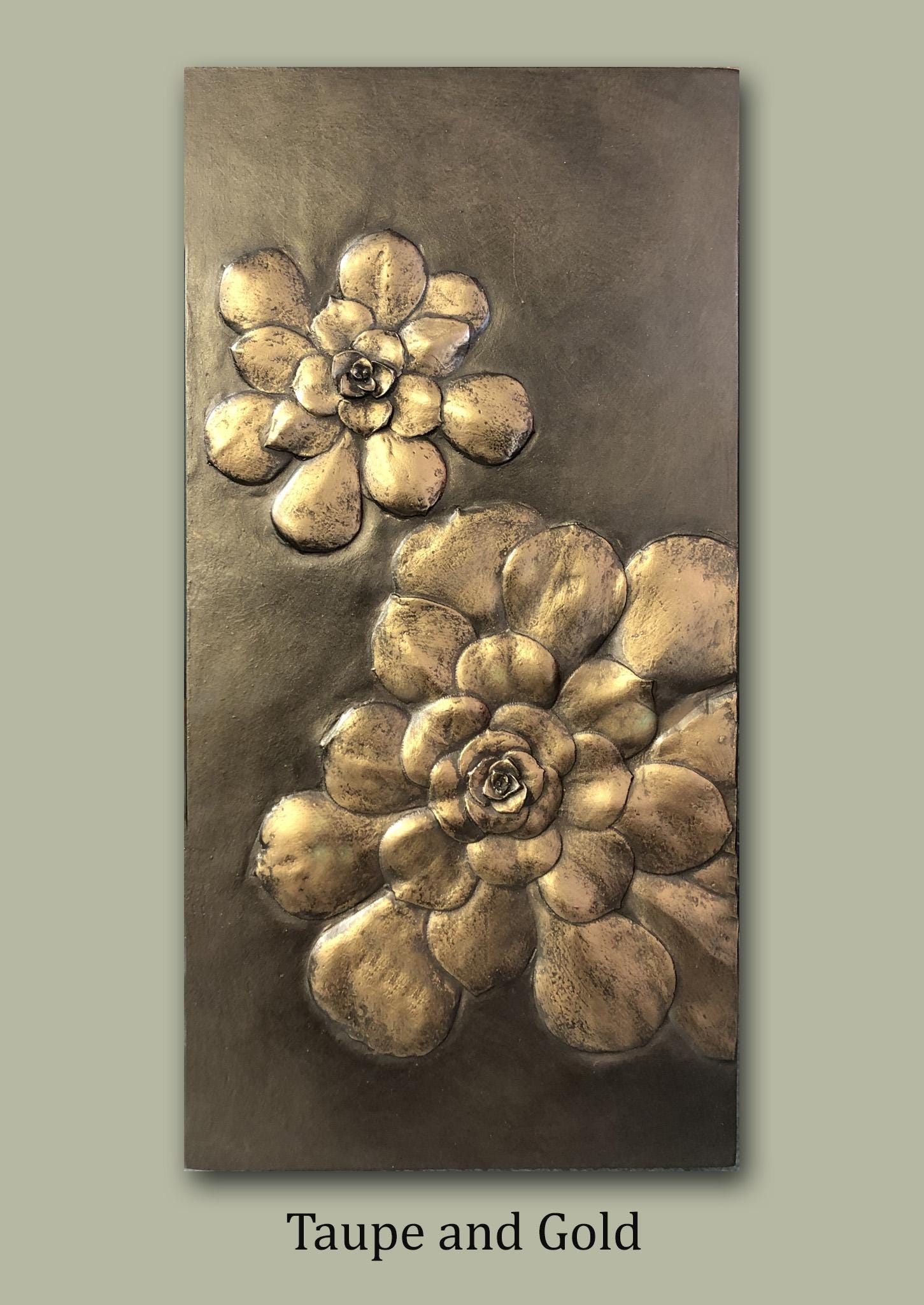 The succulents used to make this small mirror resemble giant gardenias. Although common in gardens we often dismiss them, but colored in copper, gold or silver the shape is transforms into a surreal flower.