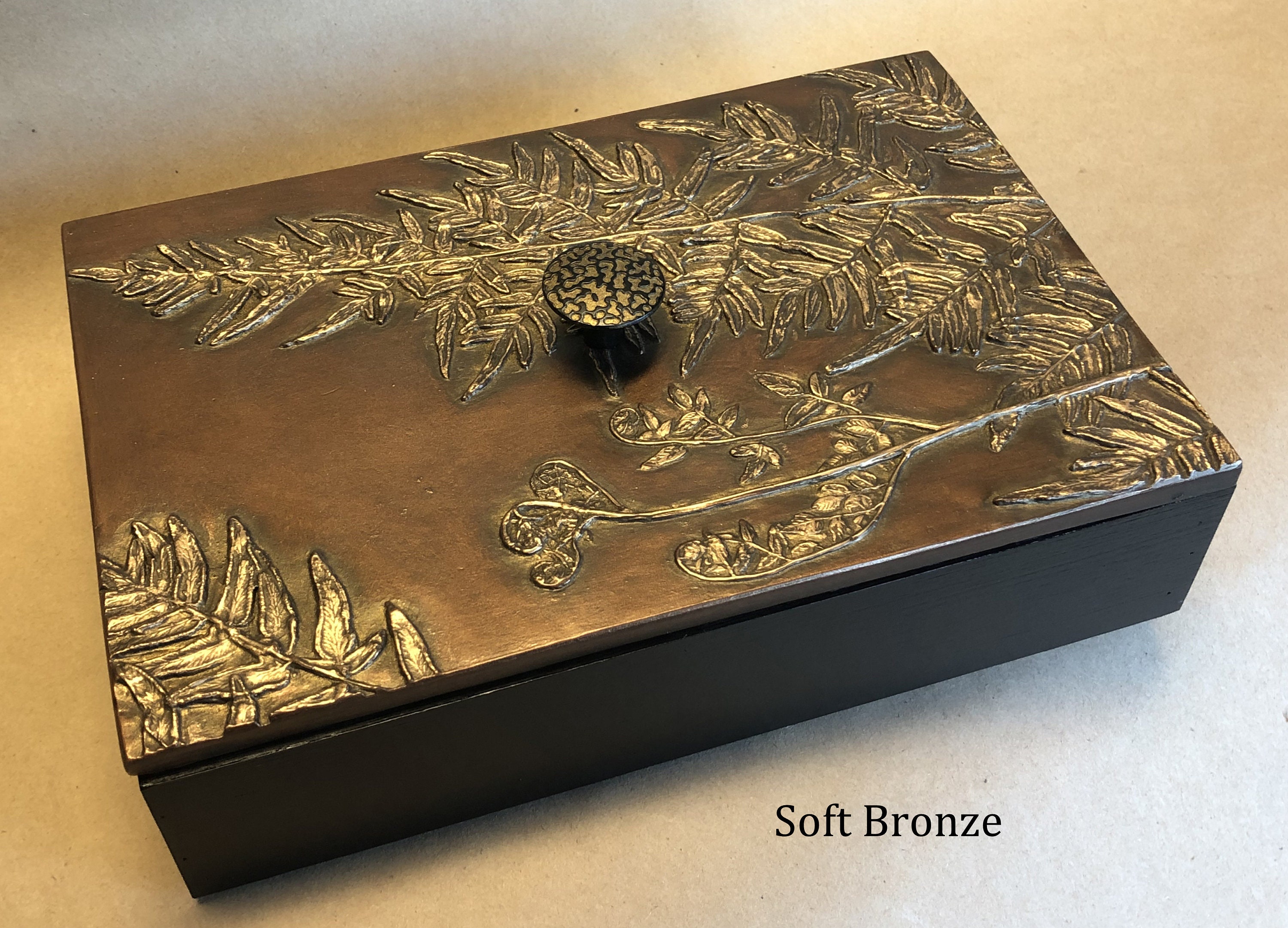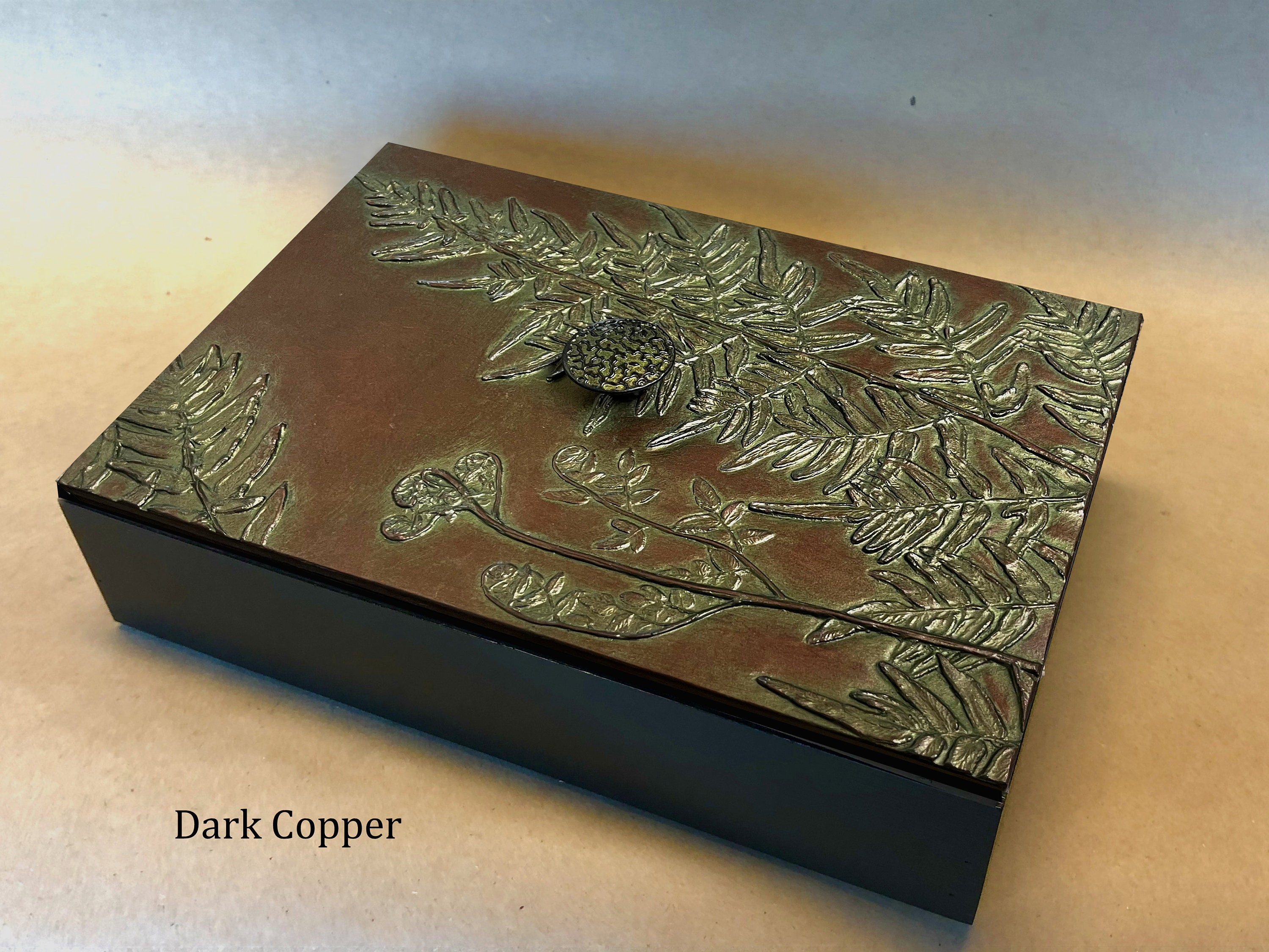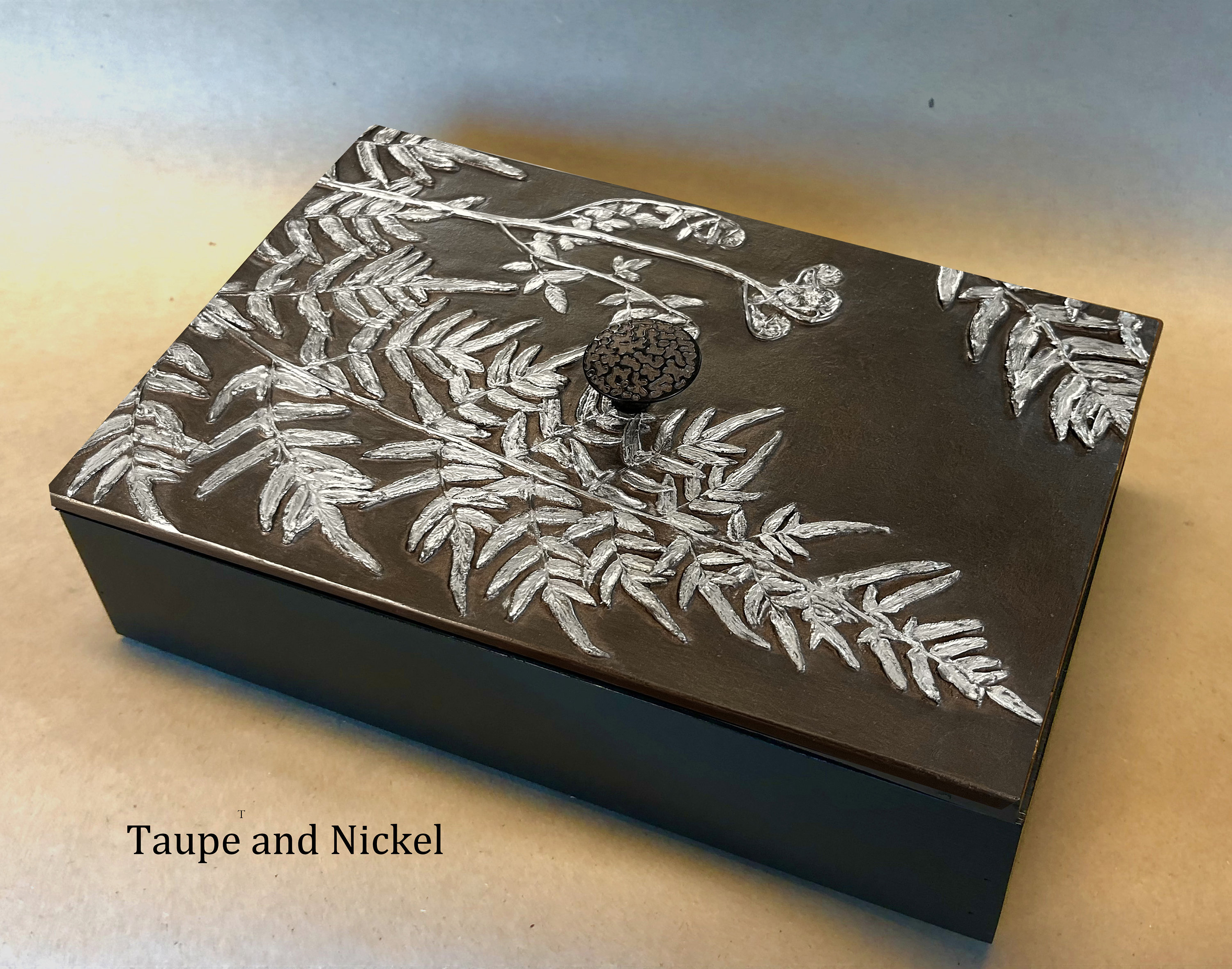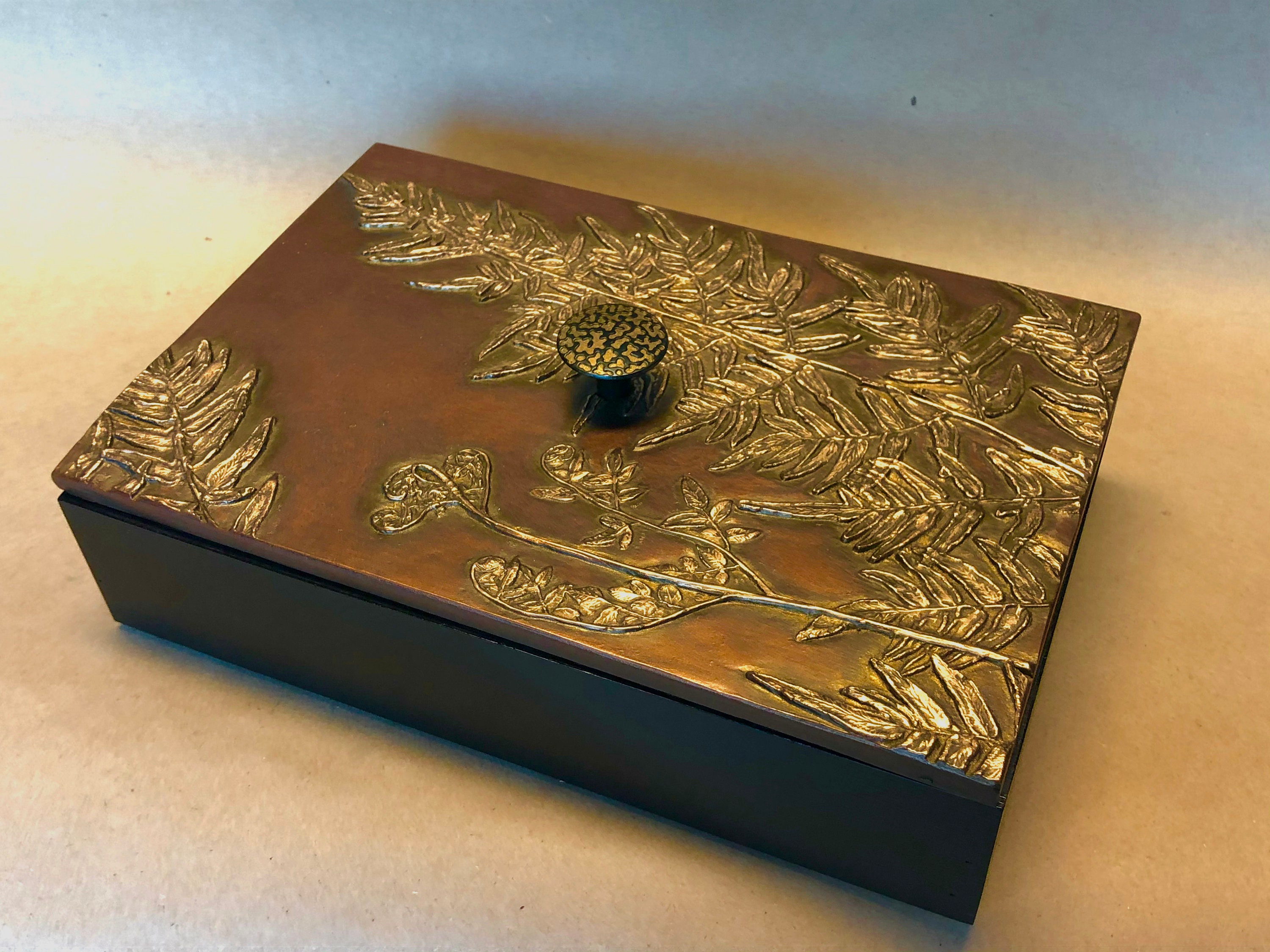 Maidenhair Fern impression with fiddlehead. Tiny leaves decorate the lid of this bamboo box. Available in 16 colors. We use the actual plant to create impressions showing the minute details of the plant.
